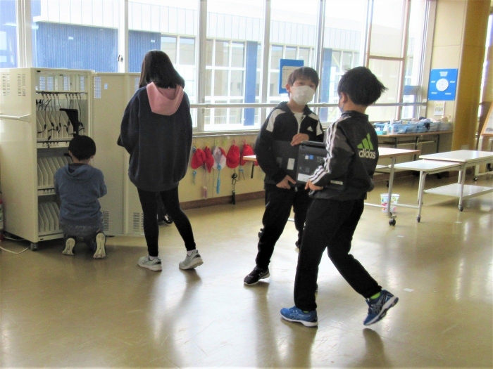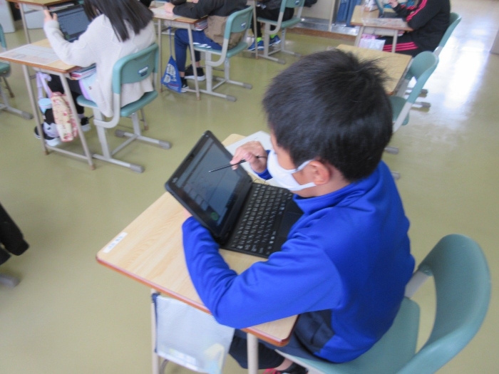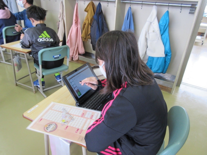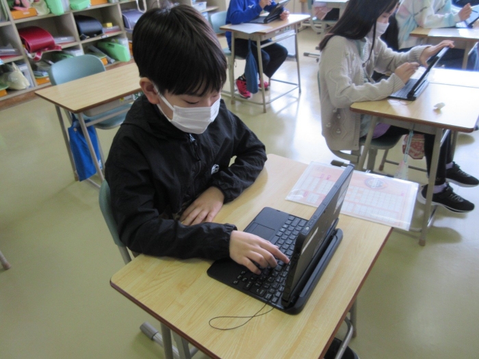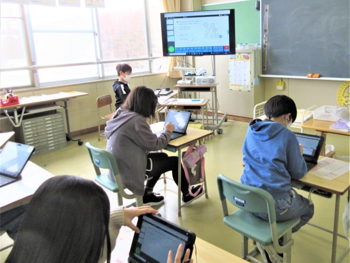本校は今年度も、一人一台配付されているタブレットを、児童一人一人の学びを保障したり、学んだことを広げたり深めたりする文房具として活用していきます。5年生は算数の授業で、早速タブレットドリルに挑戦しました。