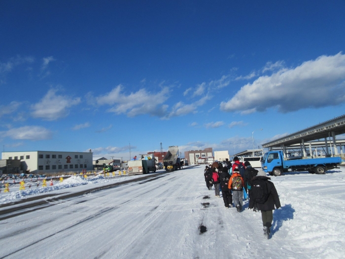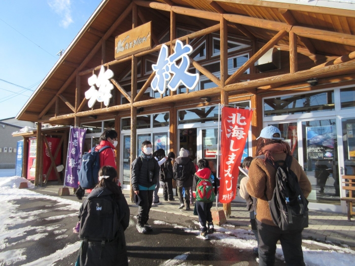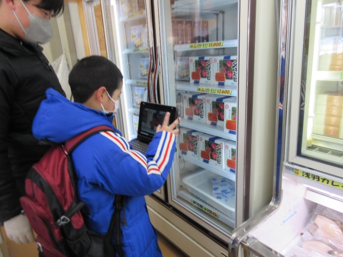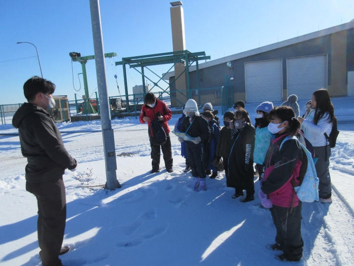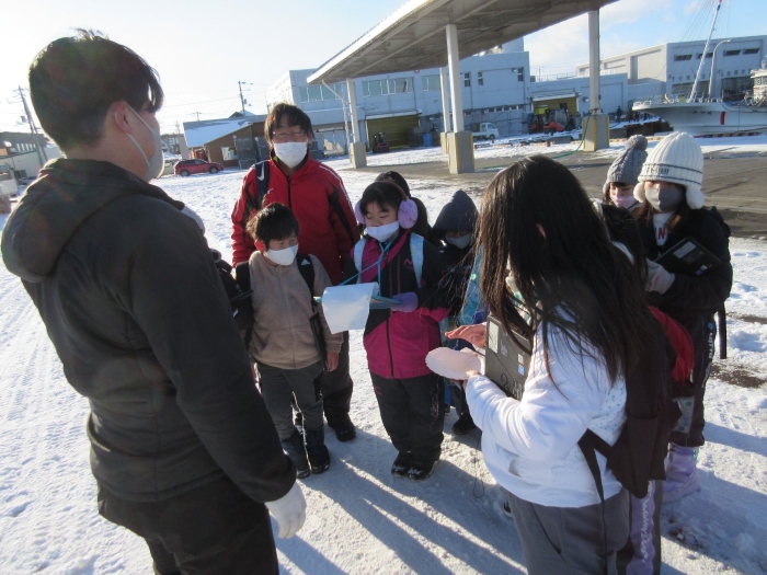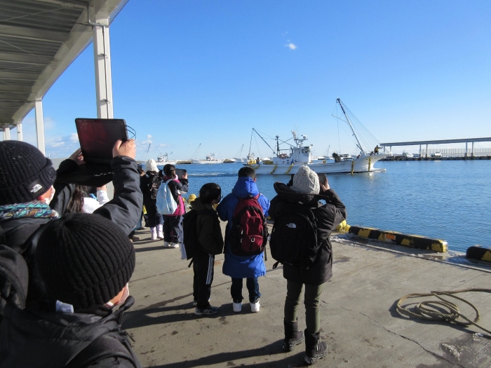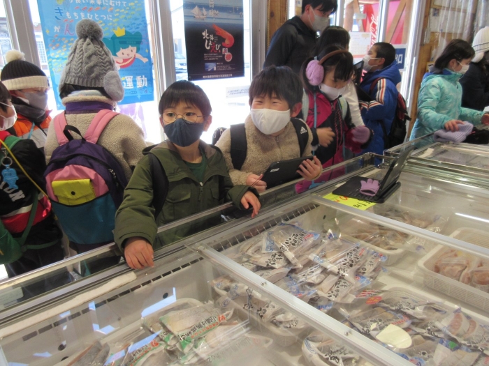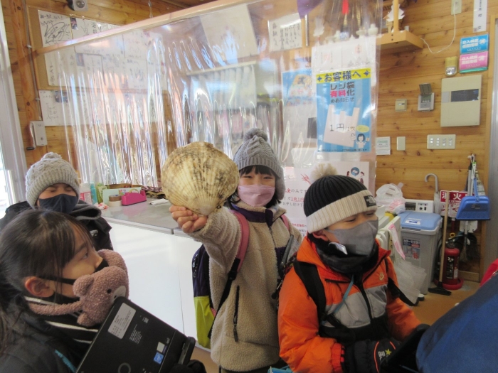 3年生は、大阪府枚方市の小学生と学習交流する情報「野付の漁業」を取材するため、野付漁港に見学に行きました。野付漁協さんにご協力いただき、ホタテ漁の船が帰港し荷揚げする様子や、直営店の店内、せりの様子を見学しました。