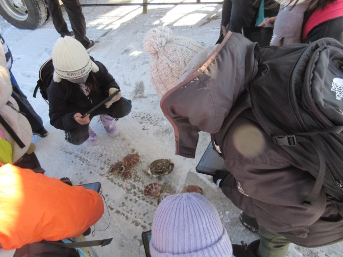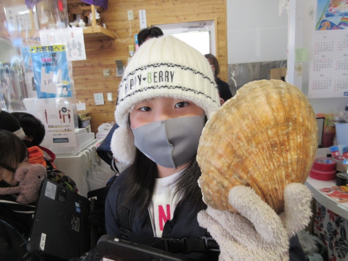 最後に、案内してくださった野付漁協の方に、「野付のホタテを動画で調べていたけれど、あんなに大きいとは‥ビックリしました。」「せりを見て値段を決めるのがあんなに一瞬だと思わなかった。」と感想を話しました。プレゼンする内容や言葉に実感や貴重な新情報が加わりました。