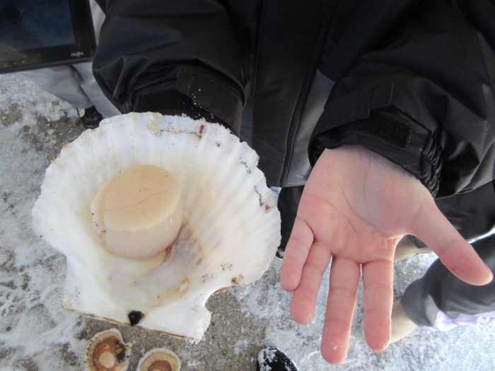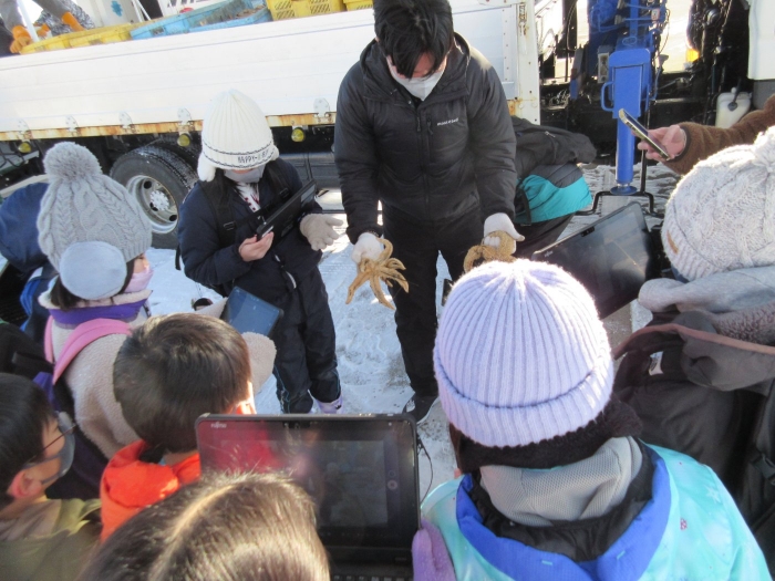子どもたちは、野付に住んでいても荷揚げやせりを見る体験は初めてです。お父さんの船が着く場面に「初めて見た・・」と感動したり、漁協職員のお父さんが働く姿に出会ったり・・。