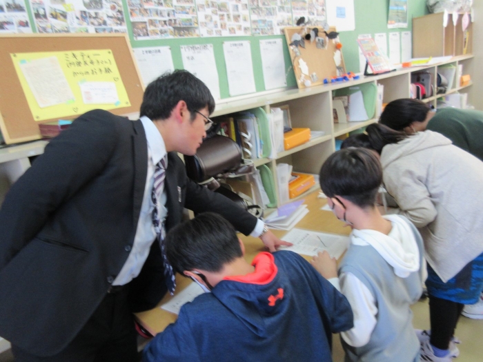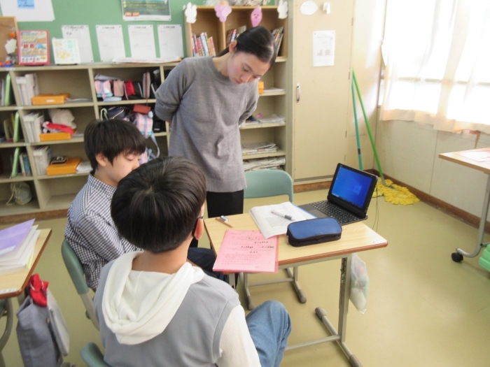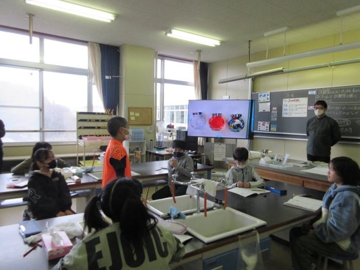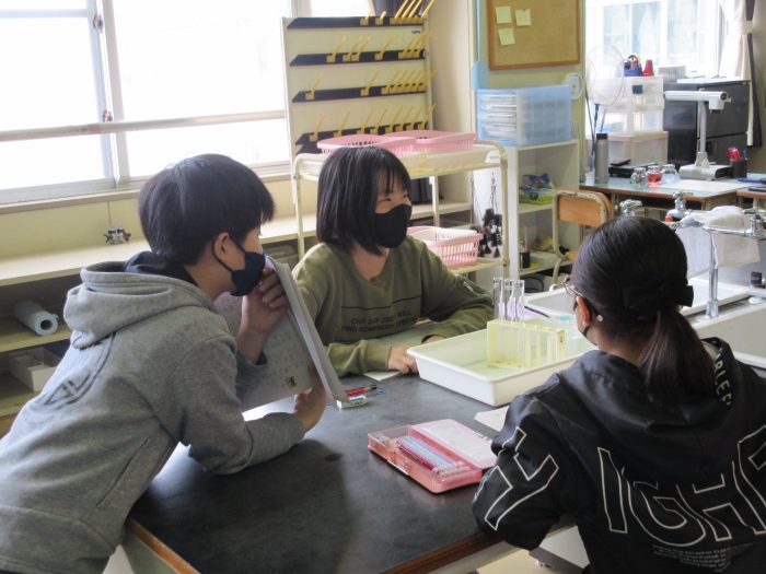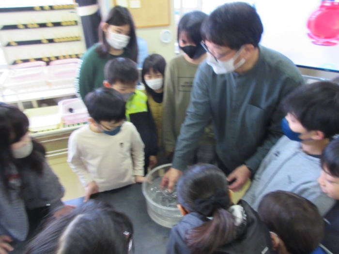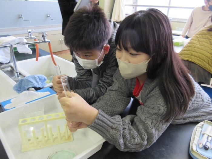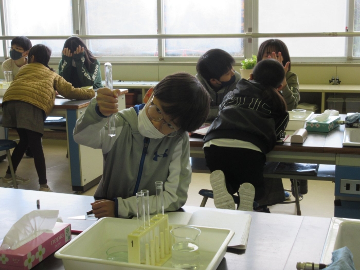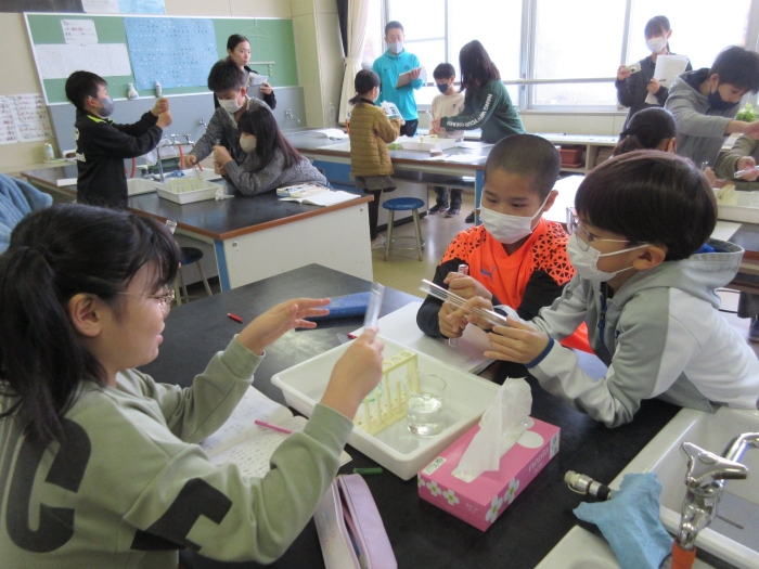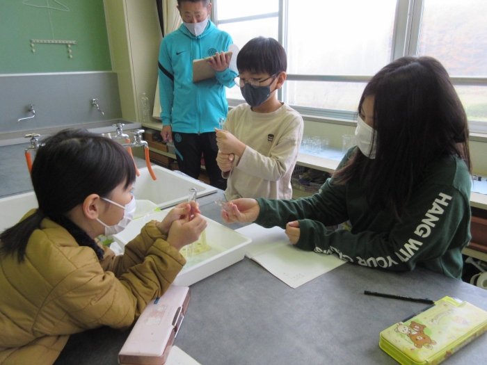 【野付小学校】探究し学び合う授業を目指して 2023年11月08日(水) 授業の様子 試験官をにぎっているとせっけん水の膜が・・ 本校は3,4,5,6年生の理科の授業を専科の先生が行っています。今日は、4年生の理科「物の体積と温度」の授業を校内の先生方が参観し学びました。子供達は変化を観察し原因を予想して、次の授業につながる考えを交流しました。 見通しをもったら 実験スタート! 変化を観察し 予想や考えをノートに書きます 考えを交流し もう一度検証・・・ なぜせっけん水の膜はふくらんだのか・・予想は次の時間につながるようです 6年生の算数の授業には中学校の数学の先生がサポートに入ってくださいました 考え方や解答へのルートを考え合う子供達 力をつけて中学校に行こう!