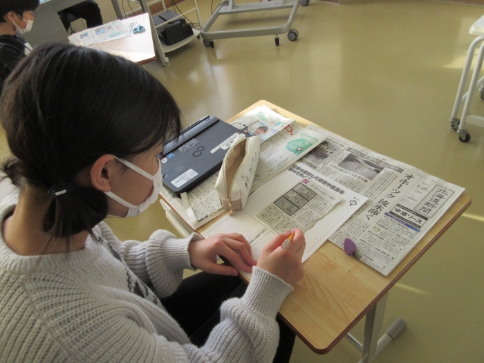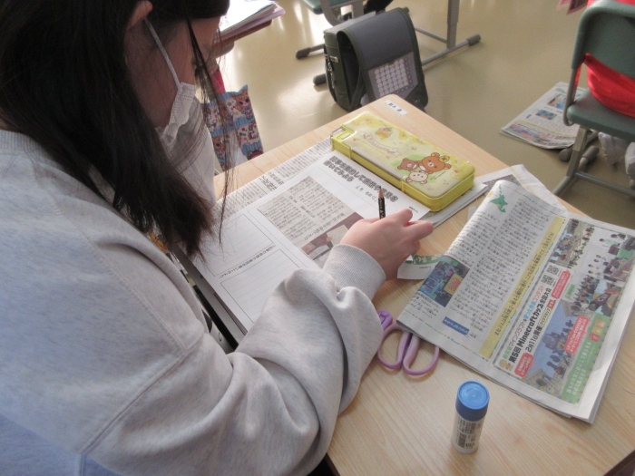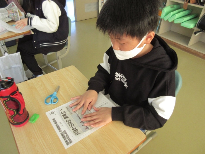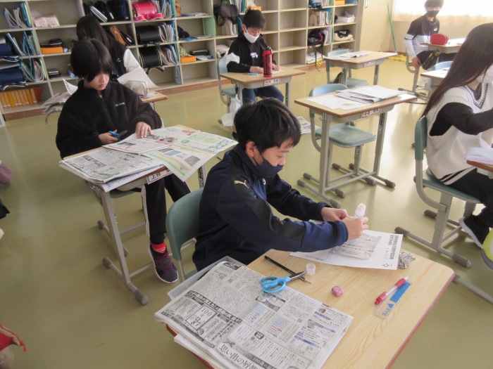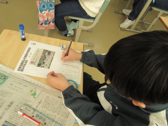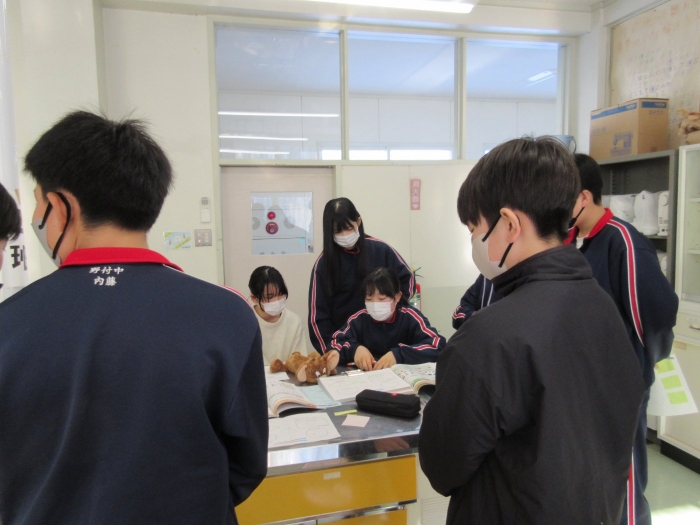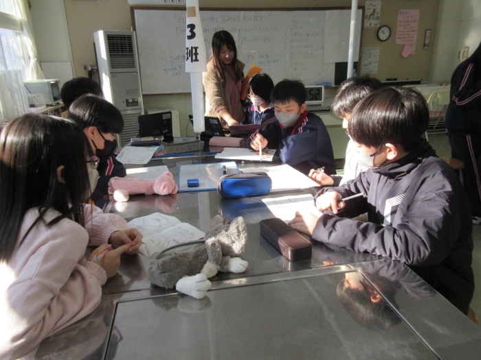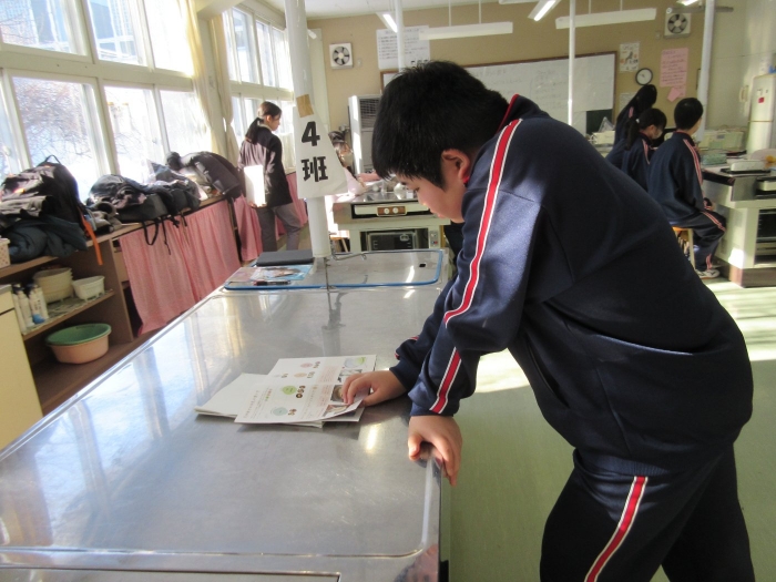 中学校の家庭科室で、ちょっぴり緊張気味の6年生でしたが、中学1年生が授業の流れを説明したり、クイズで食材を紹介したり、栄養バランスを考えるための視点や知識を教えてくれたりしたことで、迷っていたことが解決したようです。小学校に戻った後、早速献立を完成させ調理計画を立てました。