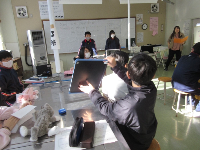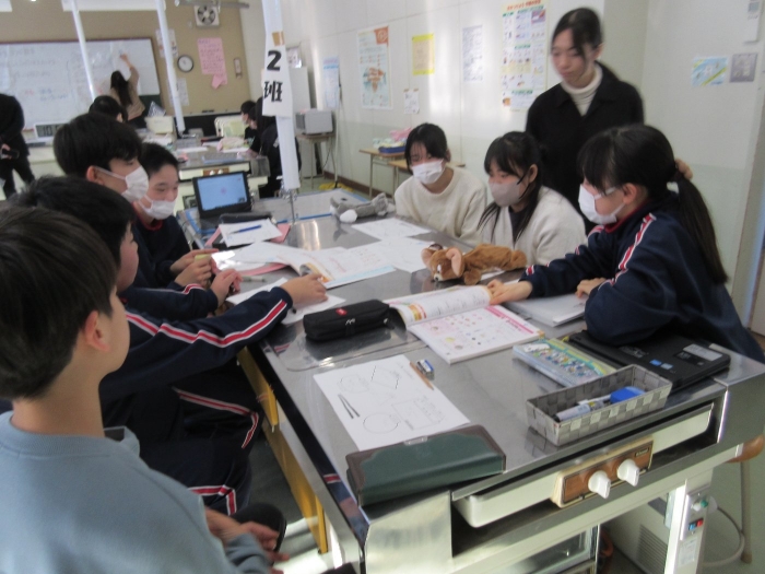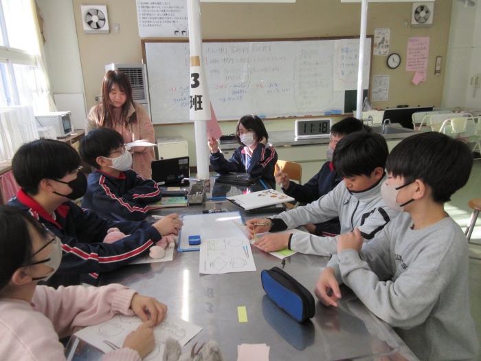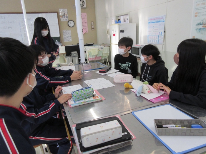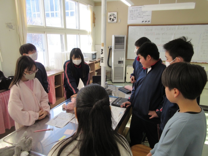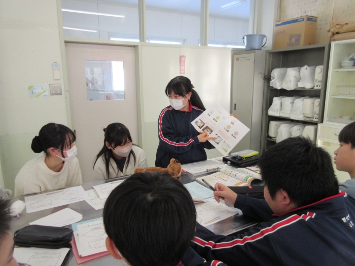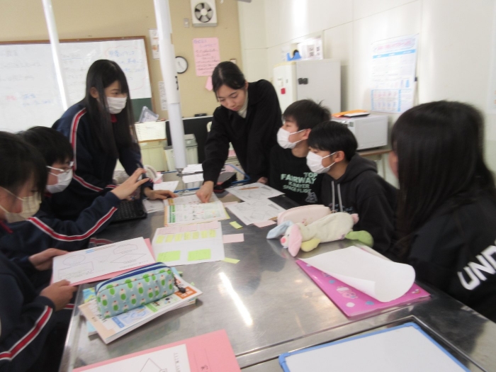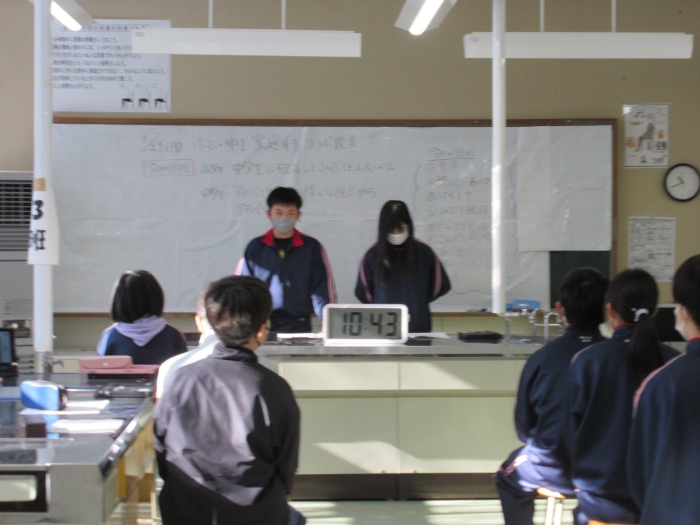 6年生は家庭科の授業で来週の調理実習に向けて一食分の献立を作成しています。そこで中学校を訪ね、この一歩先の学習をしている中学1年生にアドバイスをもらうコラボ授業を行いました。