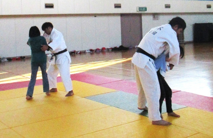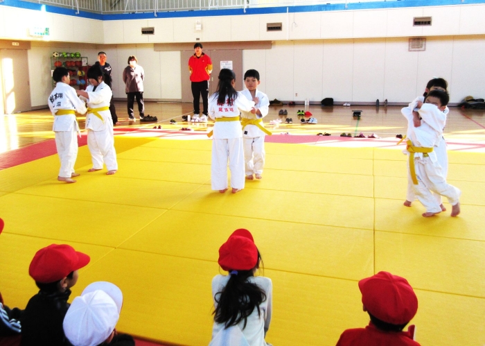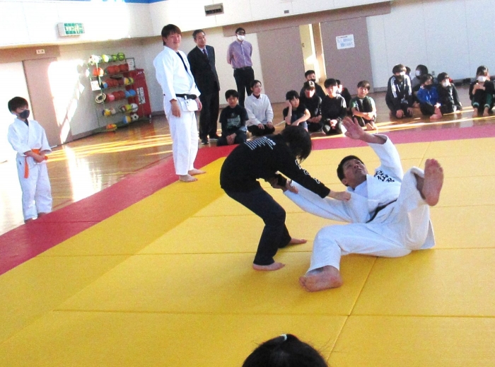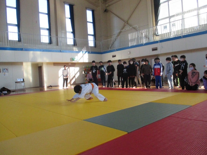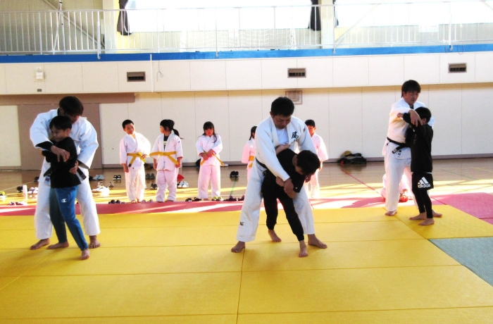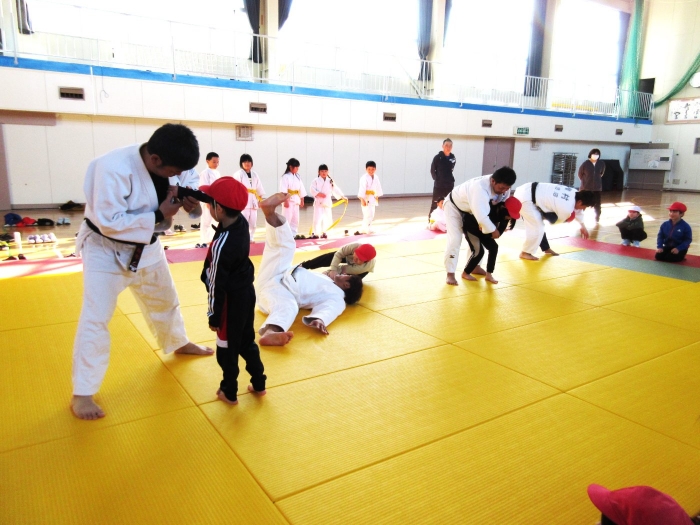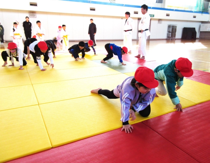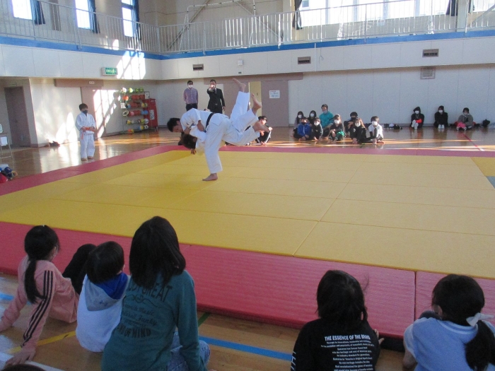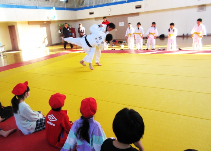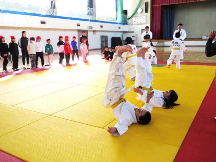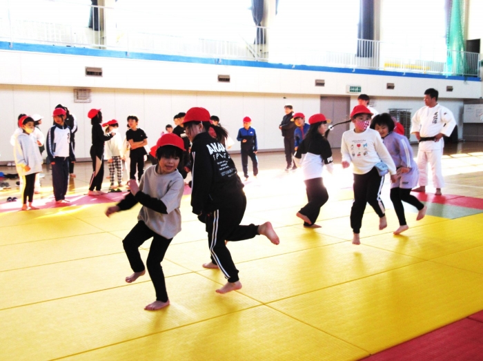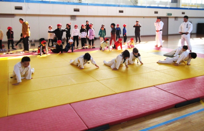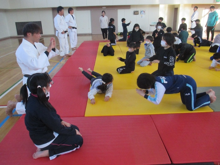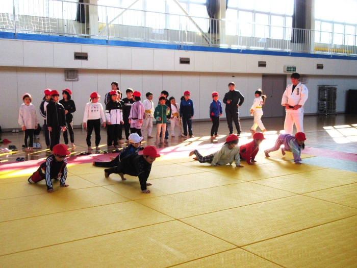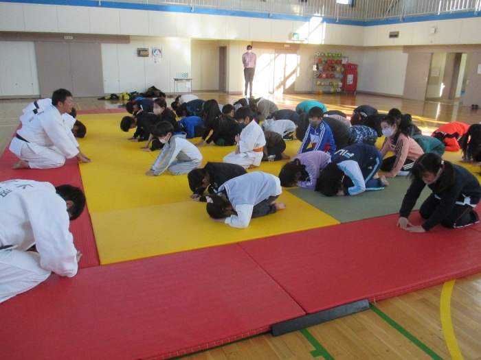 柔道少年団の所作や動きを真似ながら、準備の運動や技にチャレンジしました。筋力や体力、体感を鍛える動きが多く、子供達の体はポカポカです。最後は大人(指導者)を相手に投げ技を体験させていただきました。