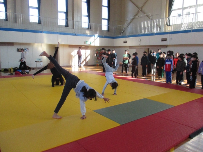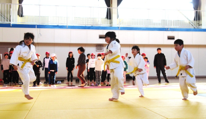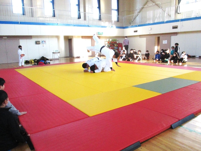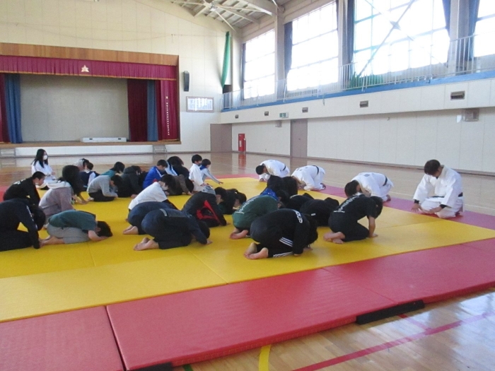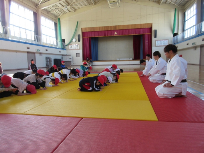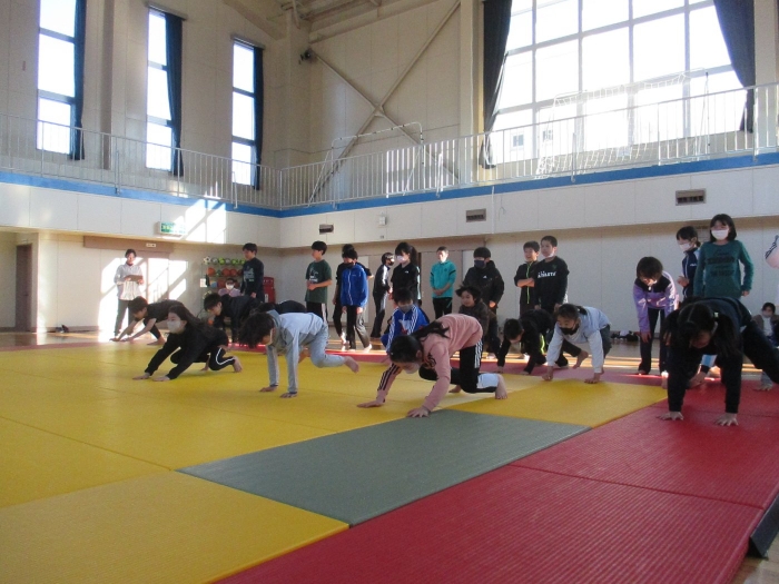 野付地区柔道少年団指導者の皆さんが、柔道体験を通して体づくり・体力向上をする全校体育を指導してくださいました。幼稚園、中学校でも実施していて、幼小中一貫の取組です。