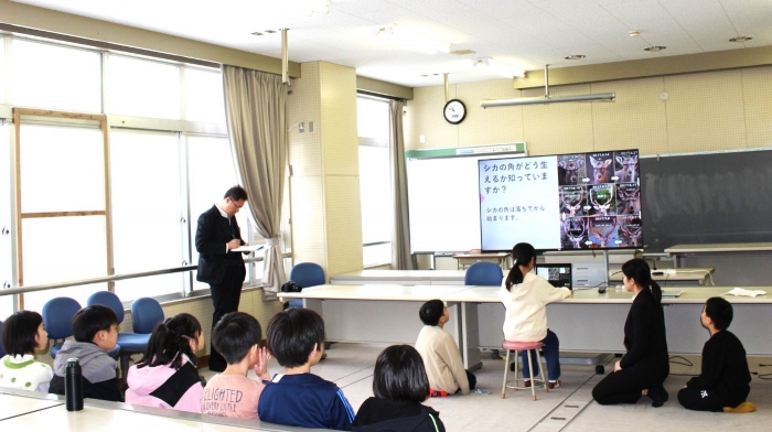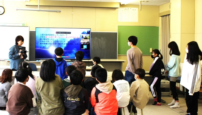 東香里小学校の4年生からは、戦争と平和について学んだことや考えたこと、探究学習の学び方や思考ツール、SDGsと関連付けた探究活動について、8つのグループ編成で発表がありました。本校の4年生は、野付学を通して学び考えてきた「自然や野生動物との共生」について、現状や取組の事例を紹介しながら発表しました。12月の別海高校生とのサミットの内容も加わっています。どちらの学校も、(人と人が、人と野生動物が)「共に生きるために自分たちができること」について学び合っていました。