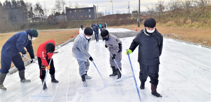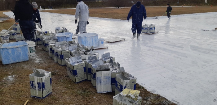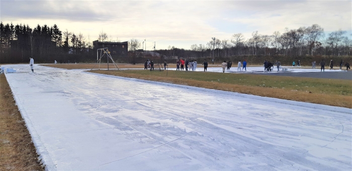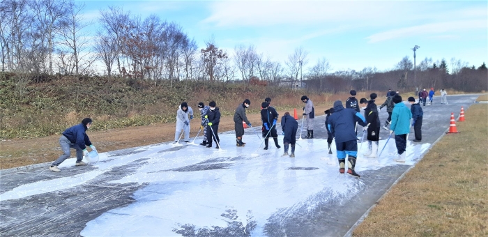 12月3日(土曜日)、冷え込んだ朝にもかかわらず、多くのPTA、小中職員、地域の方、中学生がスケートリンクに集まり、ペンキ塗りの作業をしました。参加者は汗まみれならぬペンキまみれになってペンキを運び、撒いて伸ばして塗っていきました。はつらつと働く中学生の姿が、大人の心を元気にしました。オリンピック選手を生んだ歴史ある野付学校区のスケートリンクは、見る見る白一色に塗られ、作業は予定通り終了。来る冬のスケートシーズンへの準備が整いました。参加者の皆様、ありがとうございました。