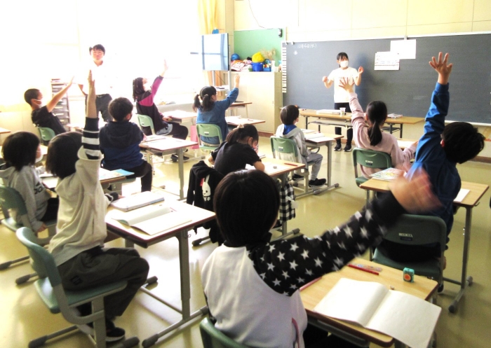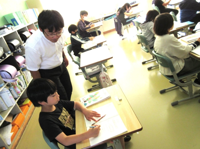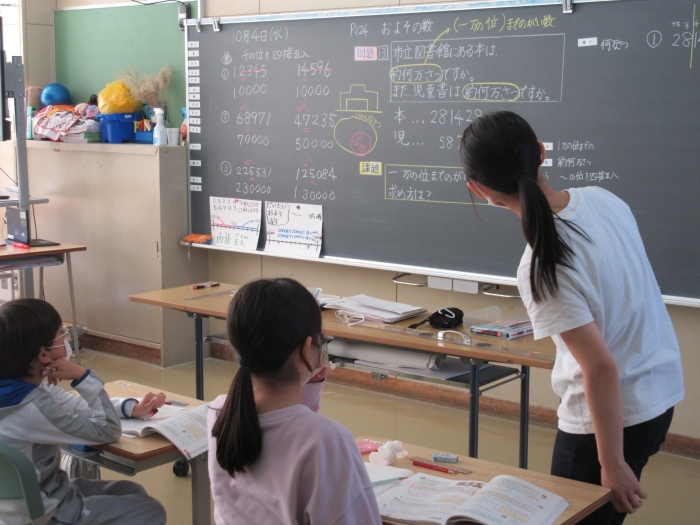 【野付小学校】中学校の先生が授業サポート 2023年10月04日(水) 幼保小中連携 中学校の先生が算数の授業をサポート 野付中学校の数学の先生が、4年生の算数の授業のサポートに来てくださいました。4年生は、大きな数を四捨五入で概数にする問題にチャレンジ!「どこの位を四捨五入したらいいのかな・・・」たくさん考えて課題を解決していく4年生の考えを聴いてサポートしていただきました。 交流場面で考えを聴いたり 作業を見守ったりしていただく中 じっくり考える子供たち