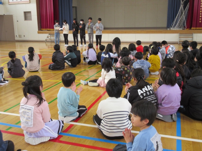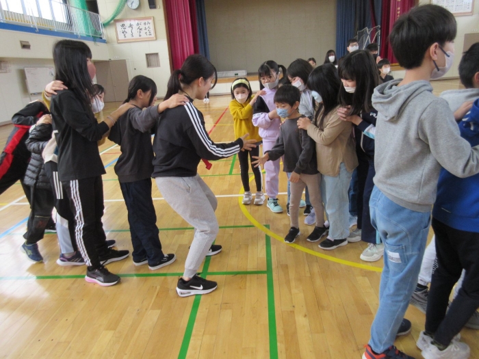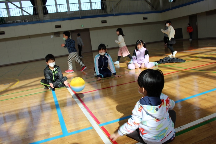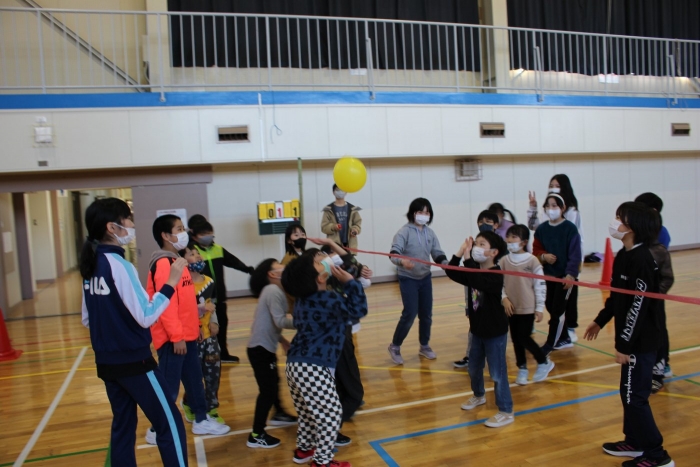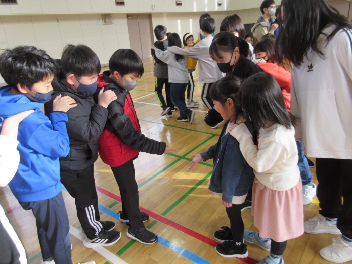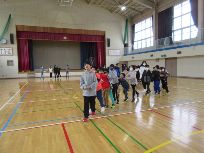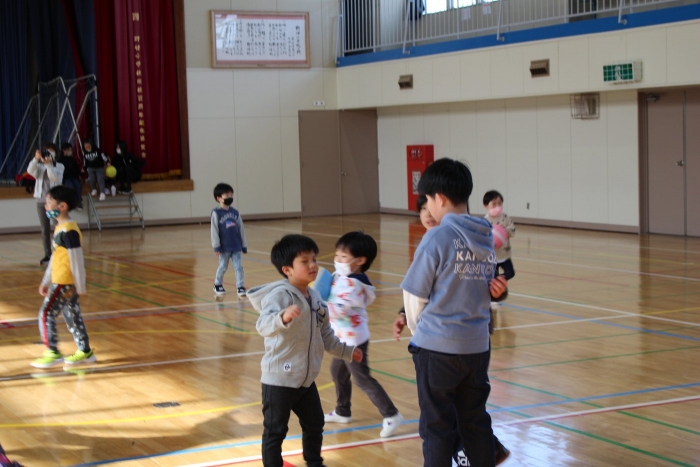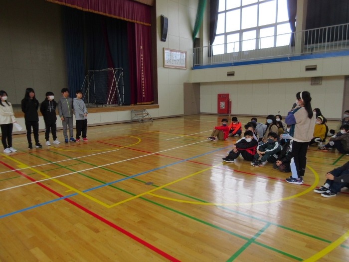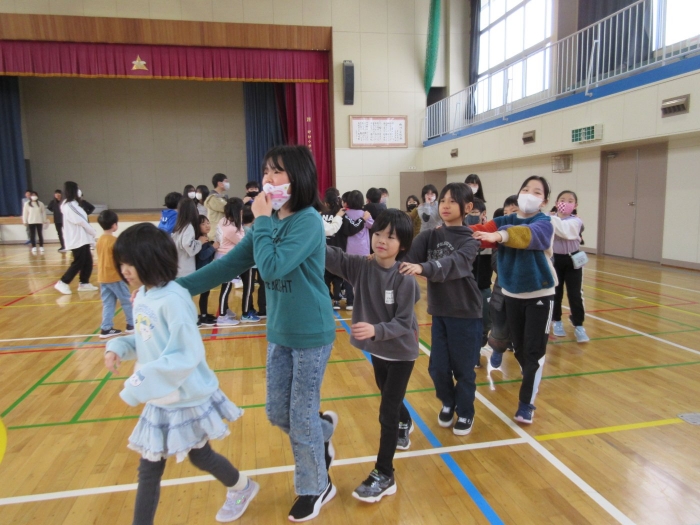 中休み、幼稚園のみなさんが小学校にやって来ました。広い体育館で、お兄さんお姉さんと元気いっぱい遊びます。チャイムがなると、サクラ組のみなさんだけ残って、4年生が考えた遊びをいっしょに楽しみました。名前を言ったり、ルールを守ったり、さすがもうすぐ1年生。新しい遊びにどんどんチャレンジして全力で楽しんでくれました。楽しい時間をありがとう!お兄さんお姉さんたちも、先生方も、みなさんの入学をとても楽しみにしたいますよ!