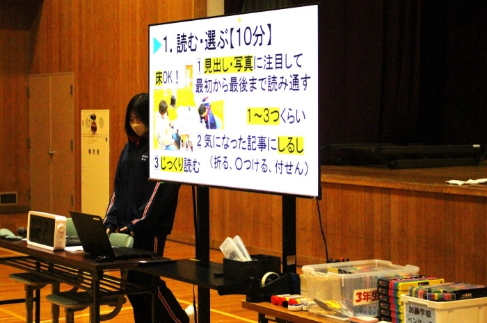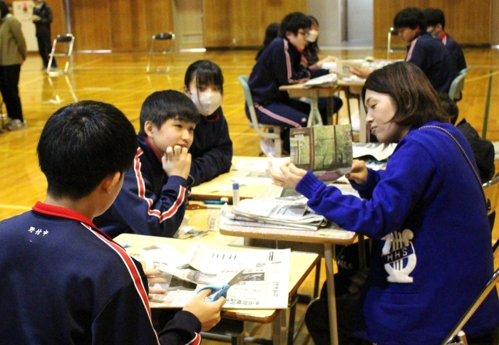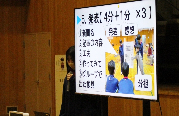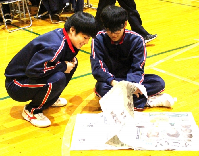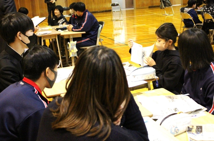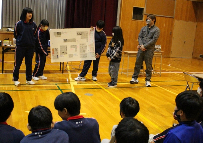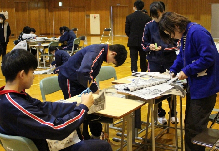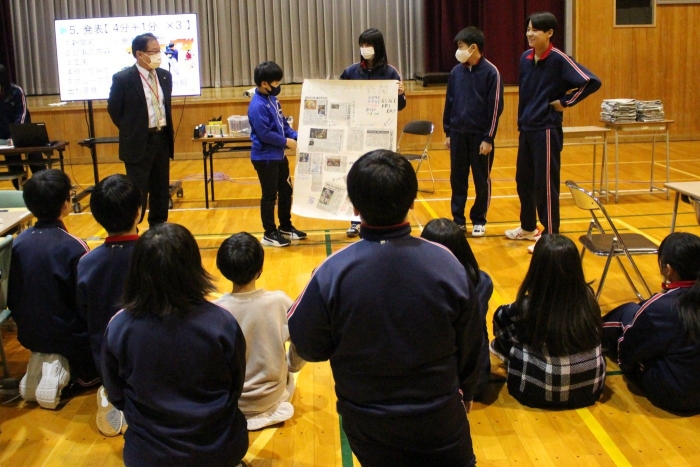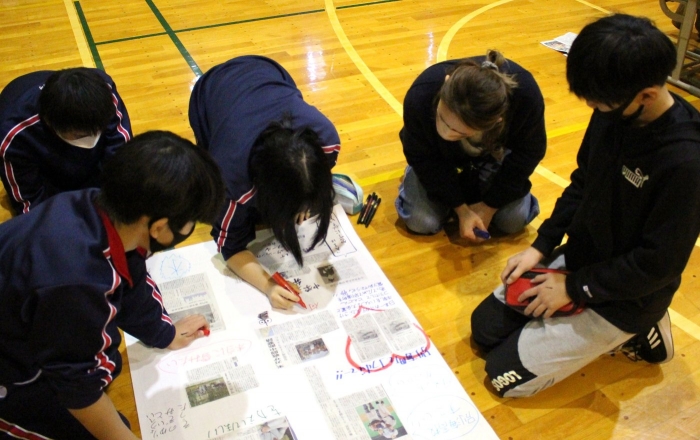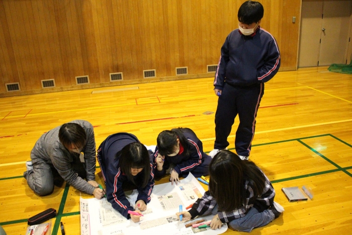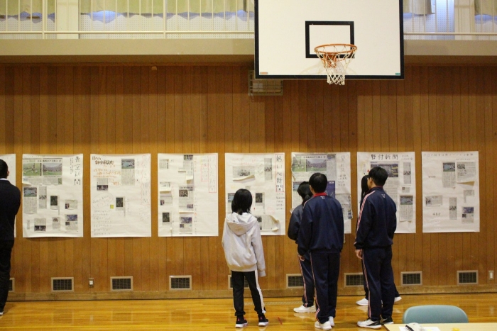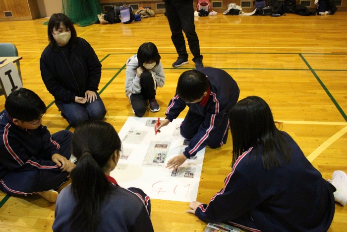 12 月 1日(金)、野付中学校体育館を会場に「野付学校区まわし読み新聞 」が行われました。活動の主催は野付学校区学校運営協議会 学びの土台づくり部会です。野付小学校 5 年生と野付中学校 2 年生に野付学校区 CS メンバーが加わり、参加者55名が 9つのグループに分かれて新聞記事を切り抜いて壁新聞を作成し交流しました。昨年度まで北海道新聞社のアドバイザーが行っていた進行を、今年は野中学校3年生が担当しました。中学3年生は、各グループでも安心して活動できるように率先して声をかけたり、まず先に行動し起点となったり、抜群のファシリテーション力を発揮していました。参加した5年生にも、かっこいい目指す15歳の姿として、目に焼き付いたと思います。最後に参加したCS方から、「野付の子のコミュニケーション能力がすごい!野付の未来は明るいです!今日の経験を自信にしてこれからも楽しんでください!」と感想をいただきました。会場が笑顔に包まれました。
