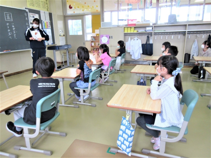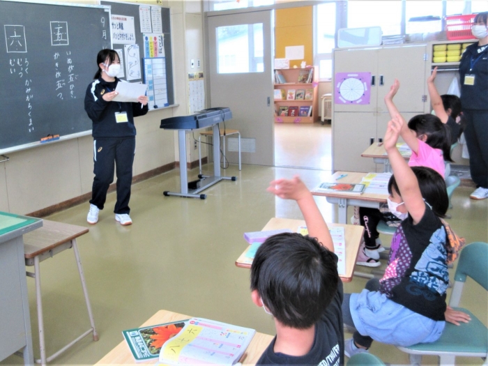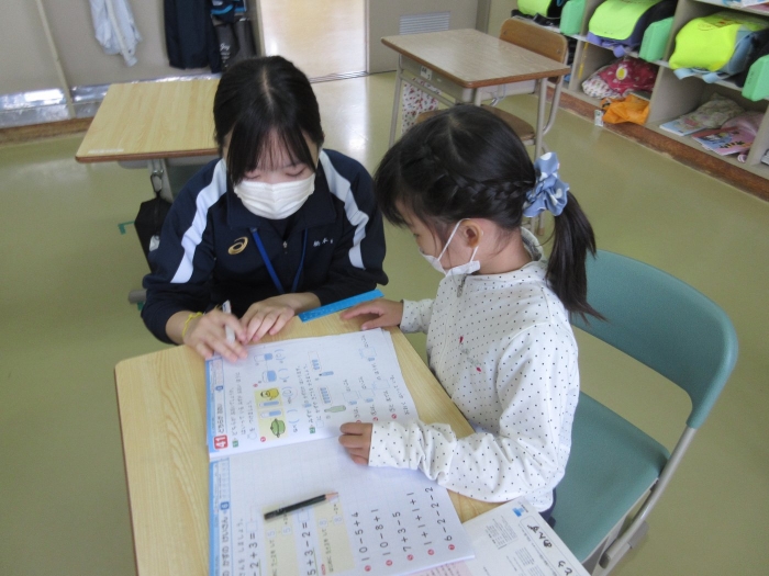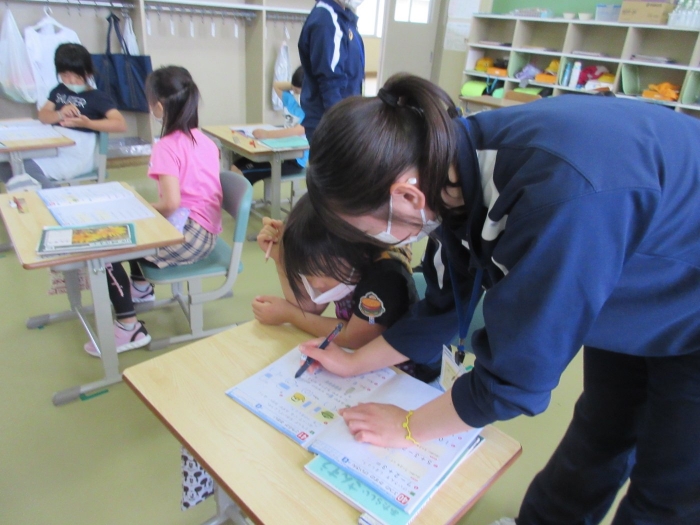 別海高校の2名の高校生が1年生教室で教育活動に関わるインターンシップ2日目です。今日は、読み聞かせや漢字を教えるミニ授業も体験しました。すごく張り切って頑張った1年生は、教えてもらった「五」と「六」の漢字を絶対忘れないって心に誓いました。