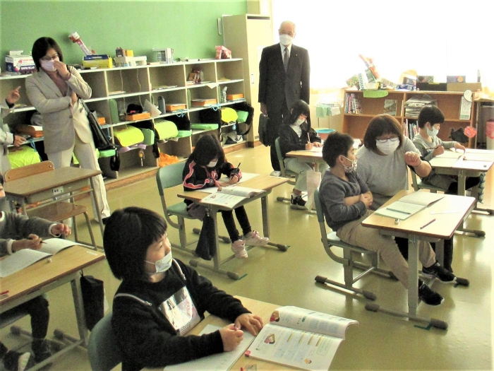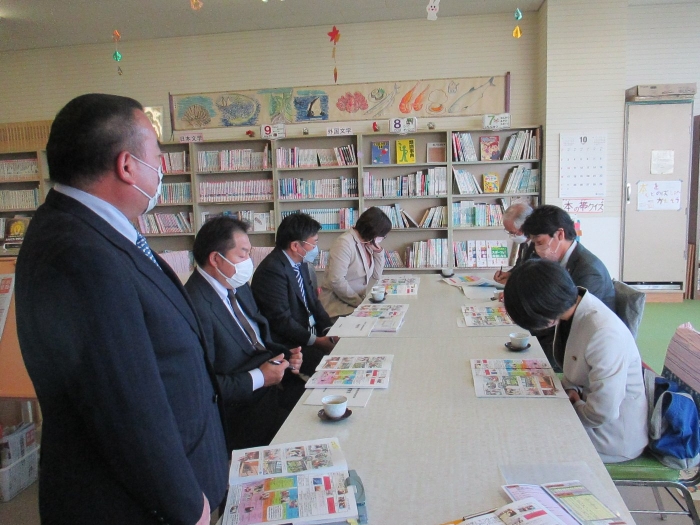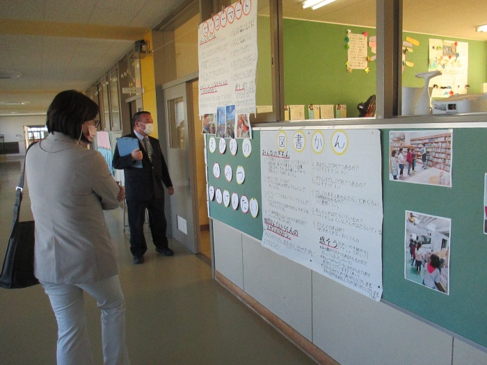 【野付小学校】教育委員訪問 2022年10月31日(月) 日々のできごと 1年生の授業を参観 いつも学校の教育活動を応援してくださっている別海町の教育委員と教育委員会の皆さんが学校訪問され、学校の様子や子どもたちの授業の様子を観てくださいました。充実した図書室の環境や、2学期の重点的な教育活動についてもご説明することができました。折しも今日は「別記町新聞の日」です。新聞を活用して学んでいる子どもたちの様子を参観していただくこともできました。 本校の教育について説明 新聞を読んでみたくなる環境の工夫 教育委員の皆様ありがとうございました