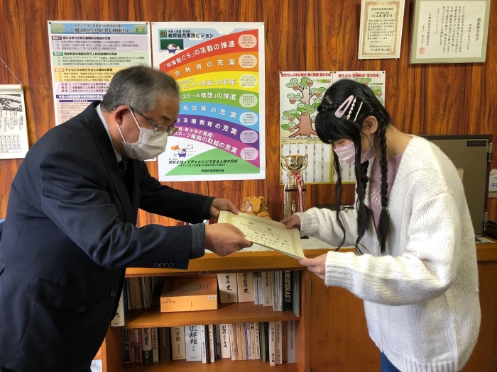 【野付小学校】税の書道展 表彰式 2022年11月16日(水) 日々のできごと 税の書道展で北海道税理士会釧路支部根室部会長賞に輝いた6年児童の表彰を行いました。北海道税理士会釧路支部より、副支部長根室部会長様が来校され、校長室で行いました。おめでとうございます。
