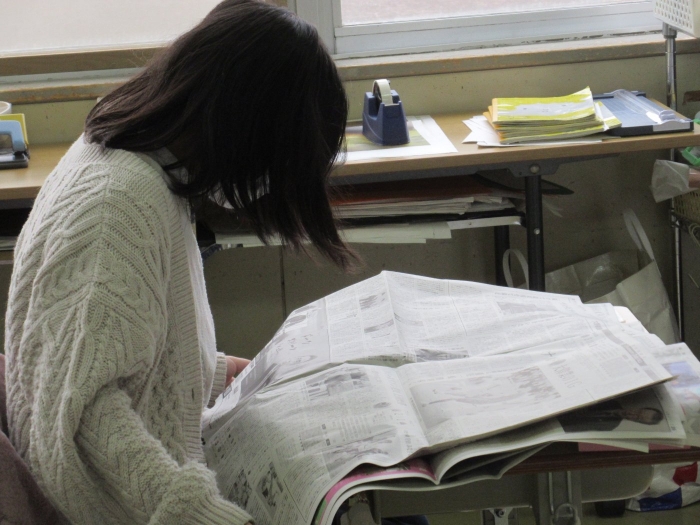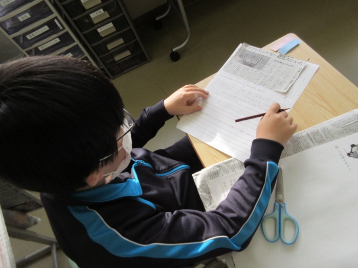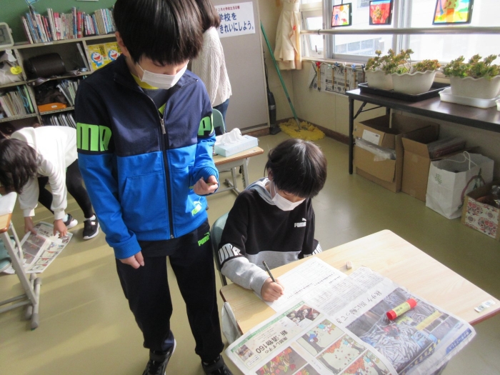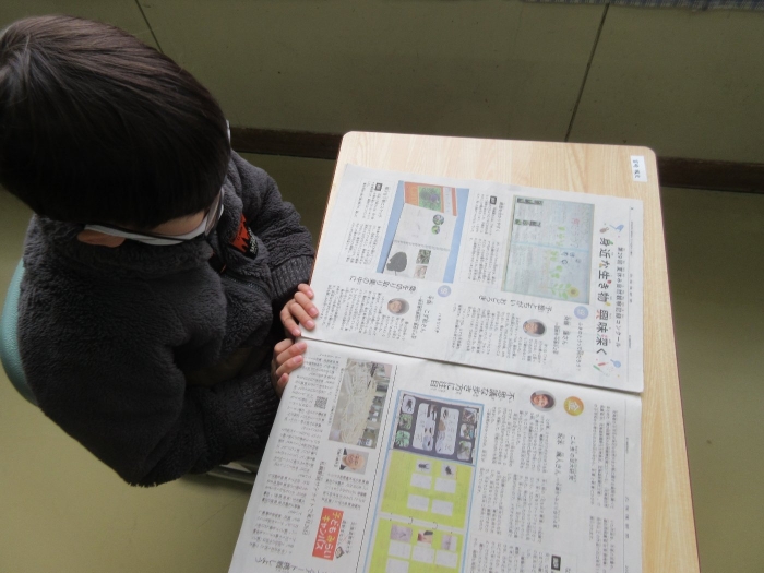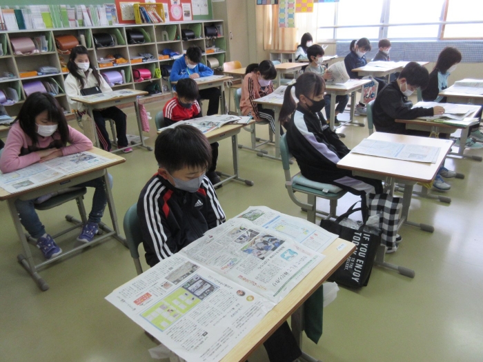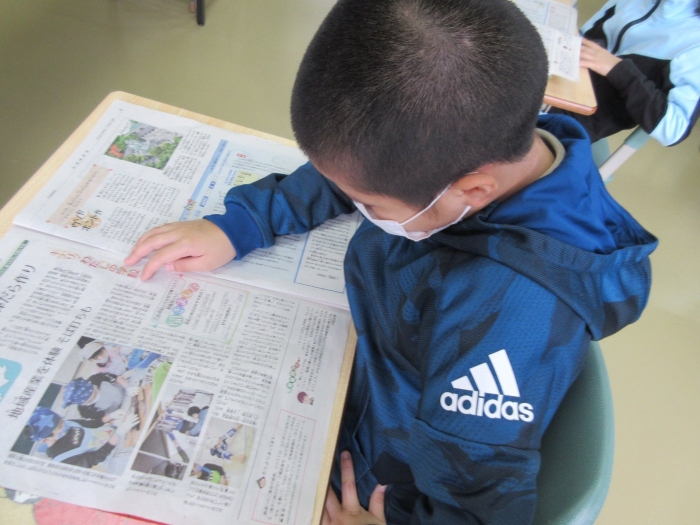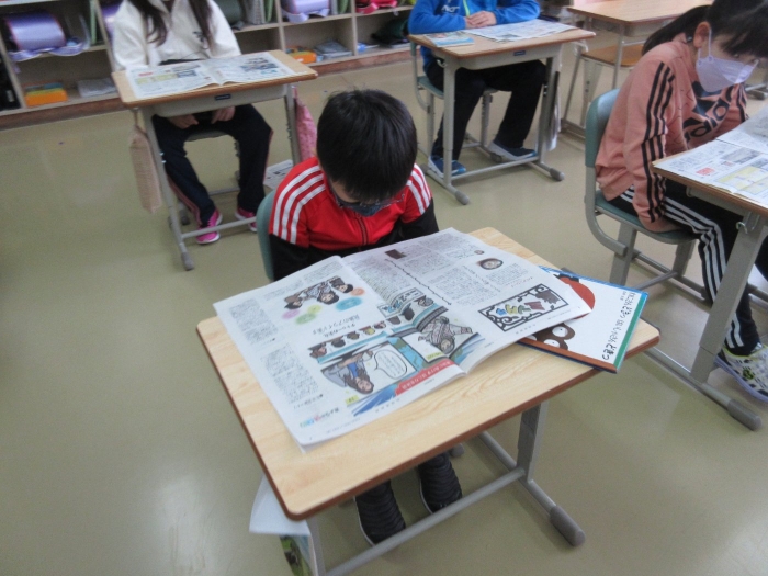 別海町新聞の日です。子どもたちは一人一人大きな新聞と子ども新聞(まなぶん)を手にして、様々な情報と出会い、ことばを豊かにし、自分の興味・関心や思いや考えを再発見して、思いや考えをまとめます。別海町が推進する新聞を活用した学びNIEです。ワークシートは発達段階や、学習経験に合わせて担任の先生が準備しているので、子どもたちは身に付けた学び方も生かしてNIEwo進めます。11月のNIEでは、考えを伝え合ったり、完成したワークシートを交流したりする活動も組まれています。子どもたちがNIEに取り組む姿から、興味を持っている事、関心のある社会問題、好きなスポーツなど、個性やこだわりも覗くことができます。この後、コモンスペースでワークシート交流を予定しています。