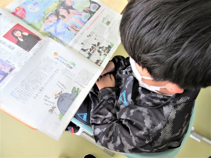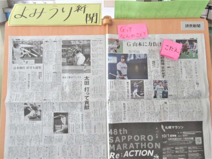 月曜日の朝は、別海町の全児童に一人1枚配布される道新こども新聞「まなぶん」を全校で読みます。今年度4月から続けているこの取組で、子どもたちの新聞を読む姿には、個性や手慣れた雰囲気が現れてきました。まなぶんの記事は漢字にルビがふってあり、難しい内容も易しく書き表されていて、低学年も高学年も、子どもも大人もみんなが親しみやすい新聞です。「朝しんぶん」で、社会への興味関心が広がって、野付小学校の1週間が始まります。