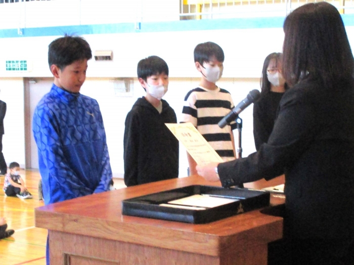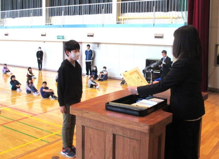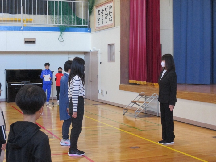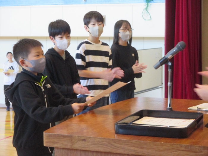 【野付小学校】表彰式、任命式 2023年10月17日(火) 日々のできごと 全校朝会で作文コンクール入賞した児童を表彰 全国豊かな海づくり大会作文コンクールで入賞に輝いた児童の表彰を行いました。全校児童から大きな拍手が贈られました。このコンクールには、5年生と6年生全員が取り組み、ふるさとの野付の海への思いや未来への決意を表現しました。5年生、6年生にも拍手が贈られました。続いて、後期の児童会役員と各委員会委員長の任命式を行いました。新しいリーダーと共に、後期もたくさんの挑戦をしていきます。 司会は今日から新役員のみなさんです 新しいリーダーのみなさんを任命 やる気に満ちた姿を頼もしく感じました!