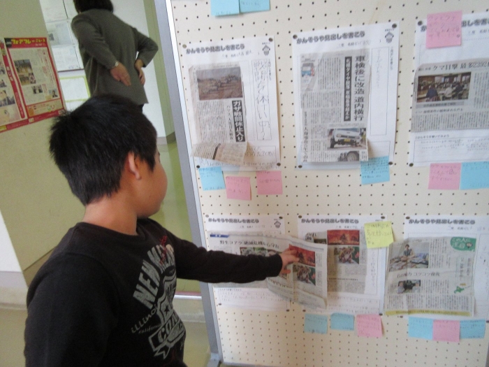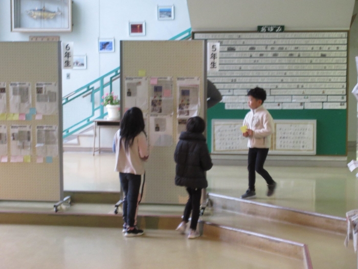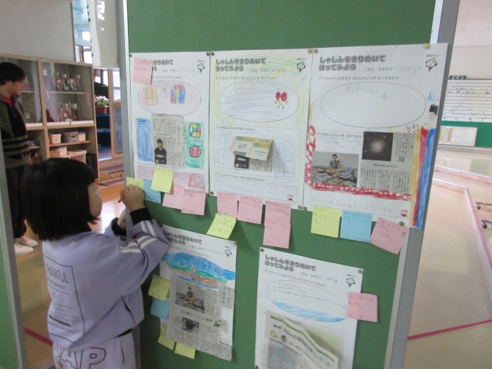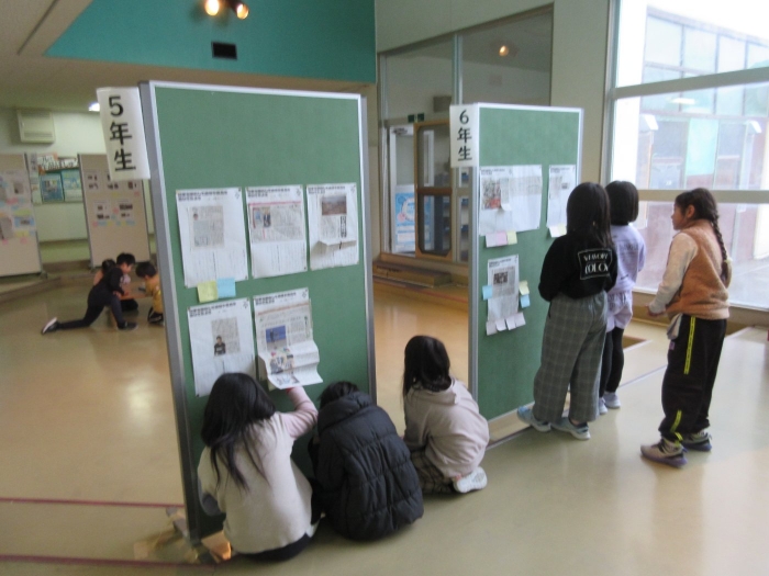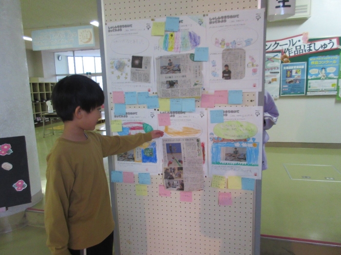 新聞ワークシート交流 2023年11月29日(水) 日々のできごと 全校の新聞ワークシートをコモンスペースで交流 NIE指定校の本校は、別海町からの新聞配布に加え複数の新聞社の新聞を読み比べて学習に生かす機会に恵まれています。年間を通じて授業や朝新聞タイムなどで、さまざまに新聞を活用した学習をしています。新聞ワークシートもその一つです。今週は、前項の新聞ワークシートをコモンスペースに掲示し、付箋紙で感想を交流しています。ご来校の折にはどうぞご覧ください。 ワークシートを読み合って 付箋紙に感想を書いて 貼ります! 気になる記事をじっくり読んだり 感想を読み比べたり・・関心が広がります!