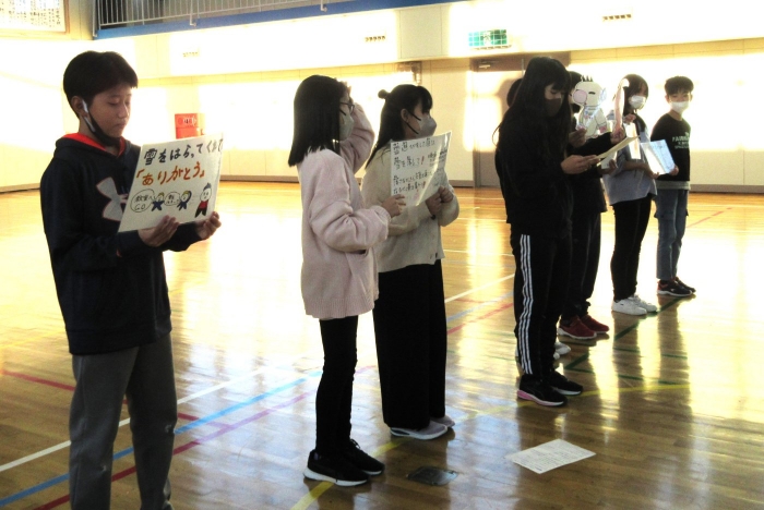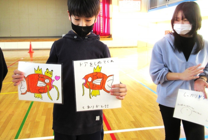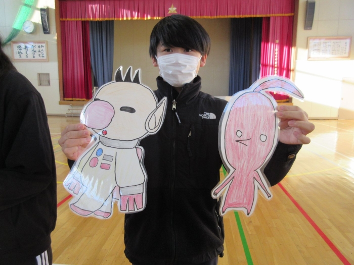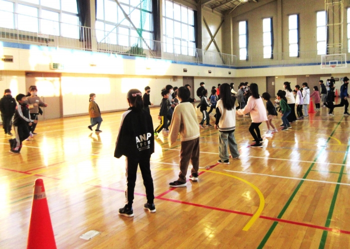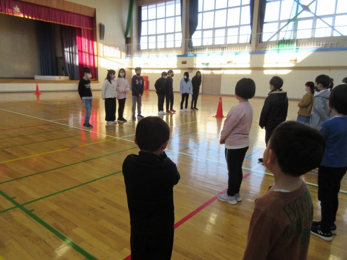 全校交流集会 2023年12月19日(火) 日々のできごと 全校で「網投げた」で遊びました 6年生企画の全校交流集会で、「網投げた」で遊びました。だんだん漁師さん(鬼)が増えて、鉄壁の網になっていきますが、突破しようと魚軍団も頑張ります。楽しい遊びで笑顔がはじけました。最後に、冬の外遊びが始まって、校舎が雪で濡れていたりドアが開けっぱなしだったりしている状況に気付いた6年生が、掲示物を作って全校に呼びかけました。さすが6年生、みんなのリーダーです。 6年生が遊びのルールを説明して スタート 最後に6年生から冬の外遊び後のマナーについて呼びかけがありました ひと工夫した掲示物にも ユーモアと 優しさがあふれています