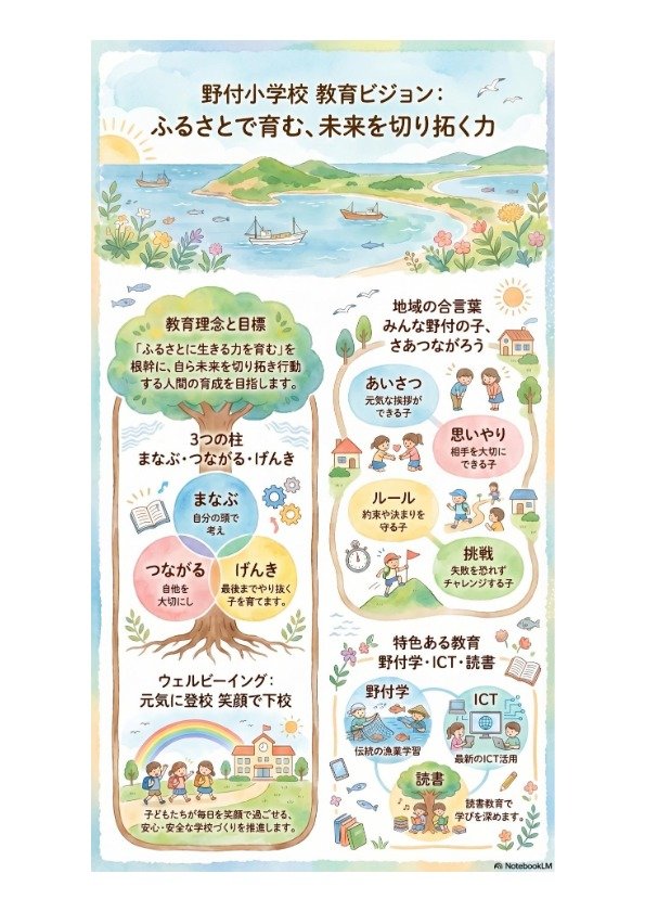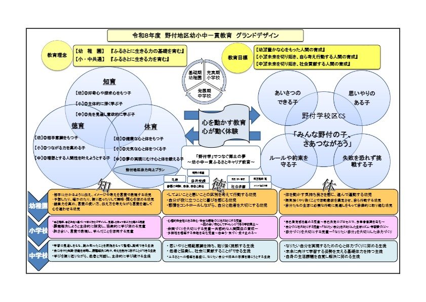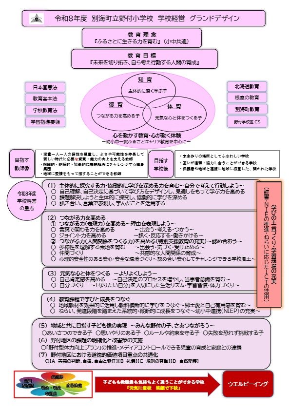 令和8年度 野付小学校の学校経営 2026年04月16日(木) NEW 概要・沿革 令和8年度 野付小学校の学校経営についてです。 まなぶ「自分の頭で考える子」 つながる「自分も相手も大切にできる子」 まなぶ「最後までやり抜く子」 の3つの柱を大切にして教育活動を行っていきます。 野付小の教育ビジョン(概要版)と幼小中連携のグランドデザインを掲載しています。