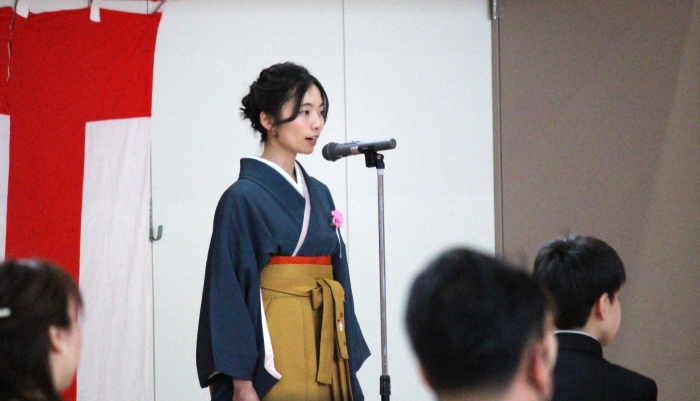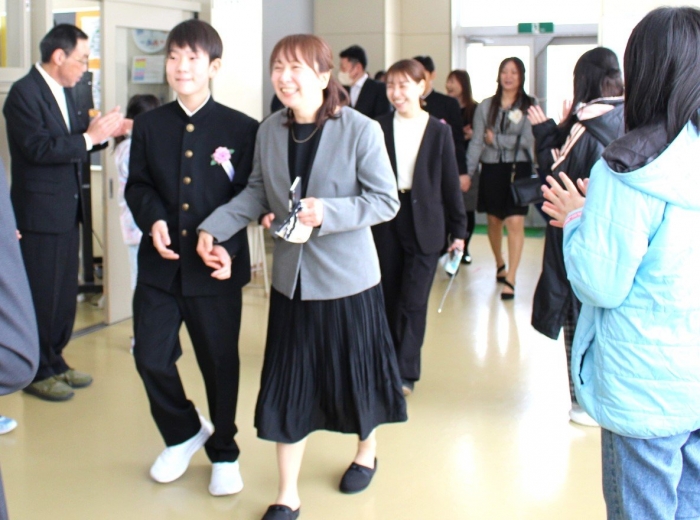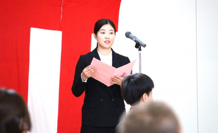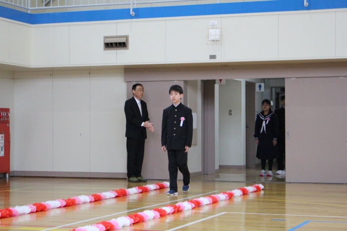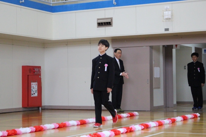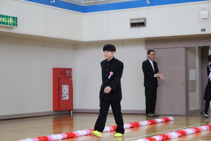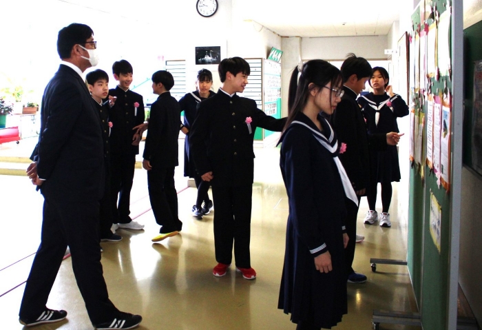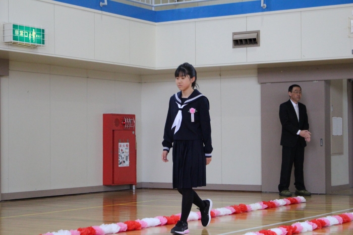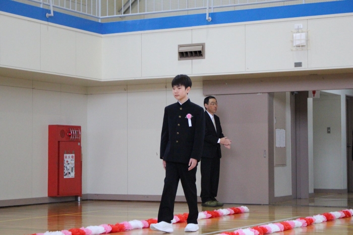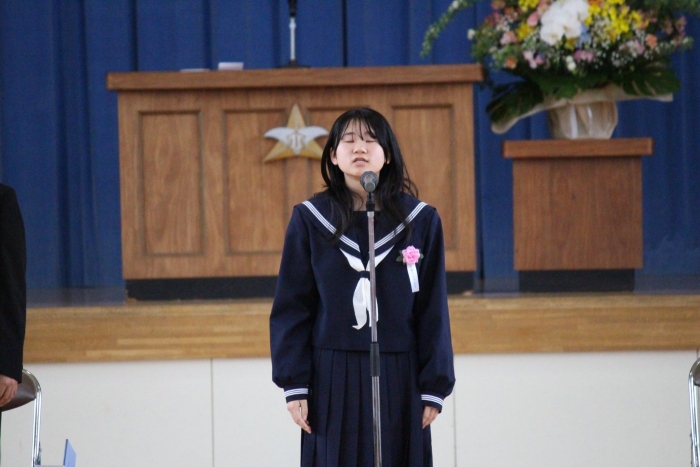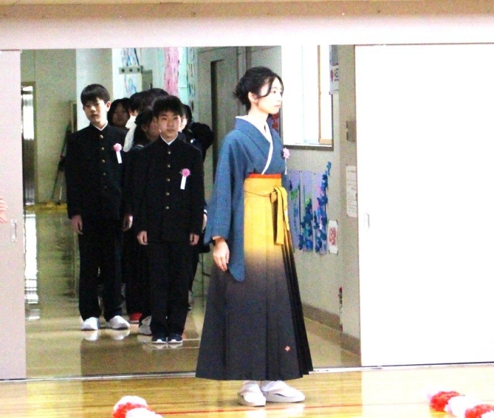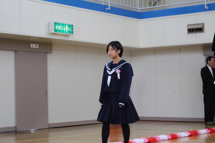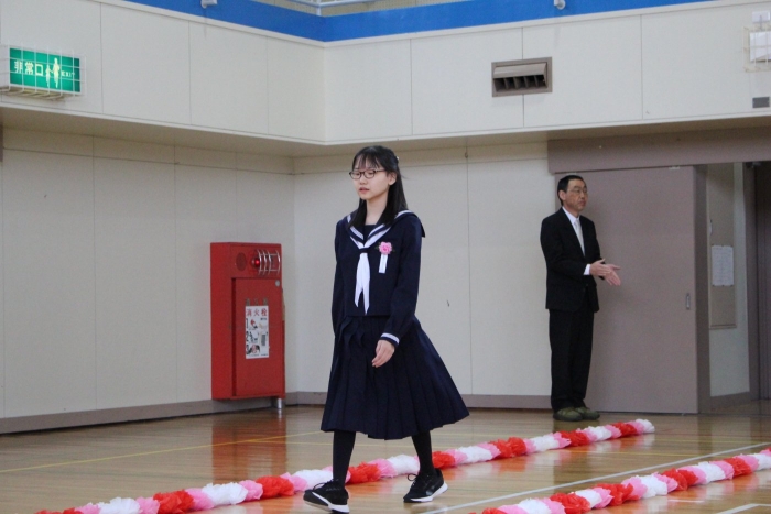 式が始まる前、お祝いのメッセージを読む卒業生。中学校の制服、似合っています。