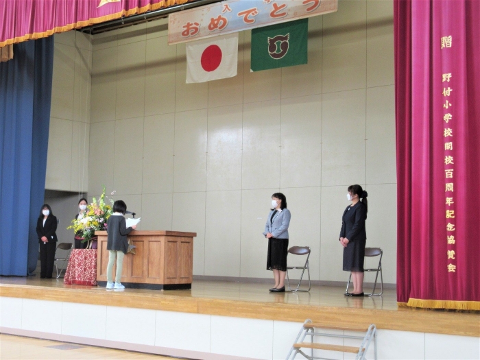 入学式の前に着任式を行いました。この4月に本校に着任した4名の教職員が、子どもたちと出会う式です。6年生代表児童の歓迎の言葉が素晴らしかったので、全文掲載します。野付小学校へのわくわく感が高まるみごとな作文です。