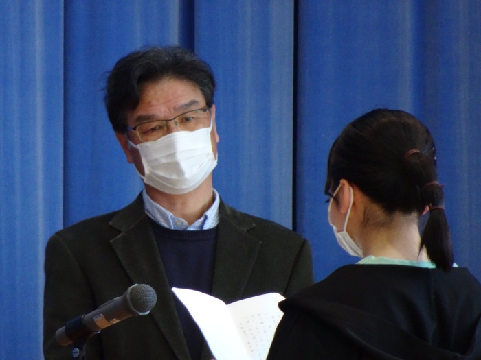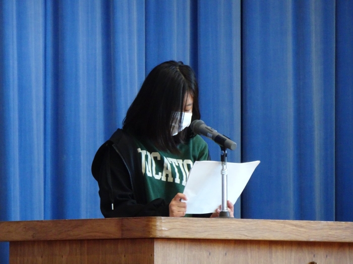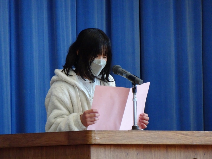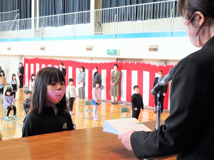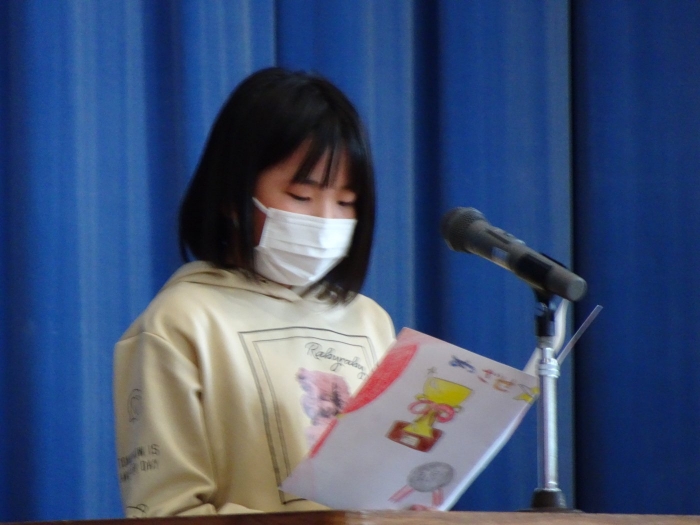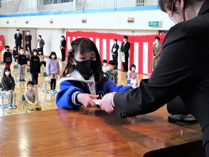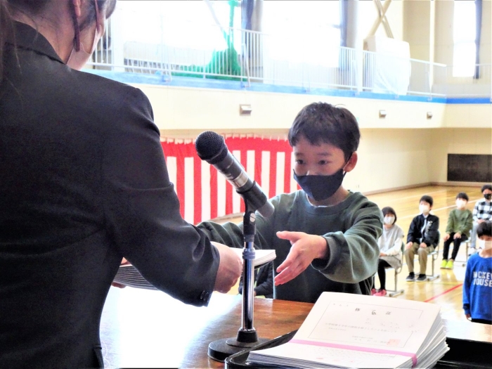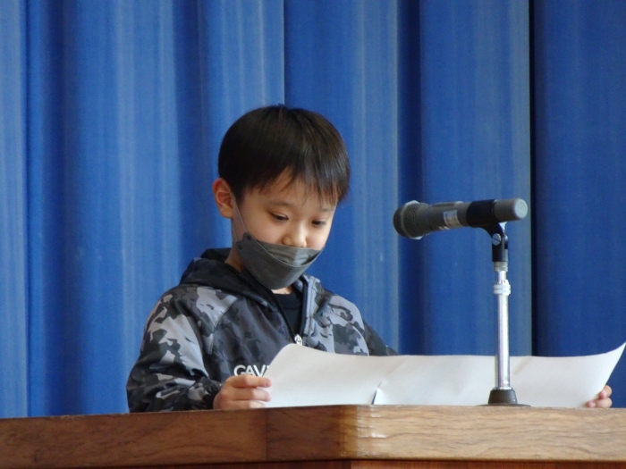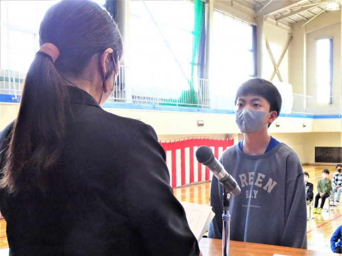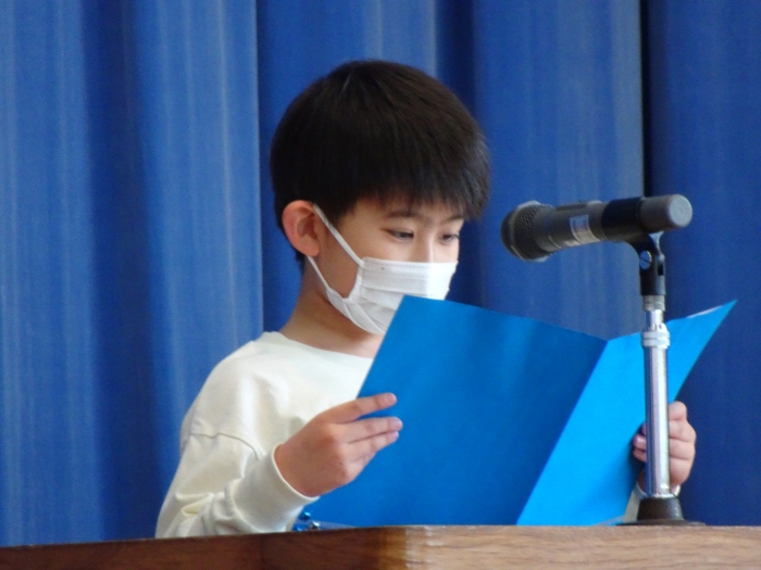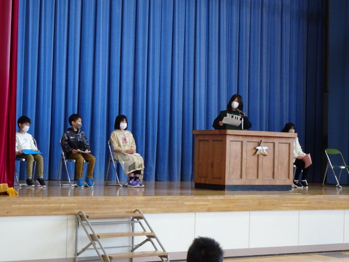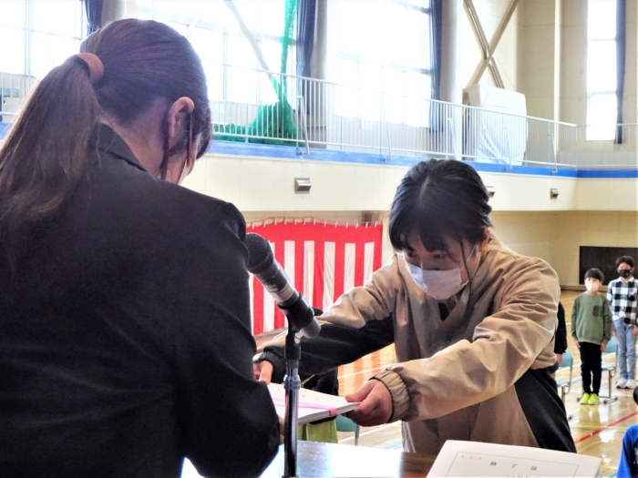令和4年度の全ての教育課程が修了しました。修了式では代表児童が立派な態度で修了証書を受け取り、5名の代表児童が一年を振り返って実感している成長や、次の学年への期待と抱負を発表しました。校長からは、成長をつなぐことについてお話をしました。返事や聴く姿からも成長を感じる修了式でした。