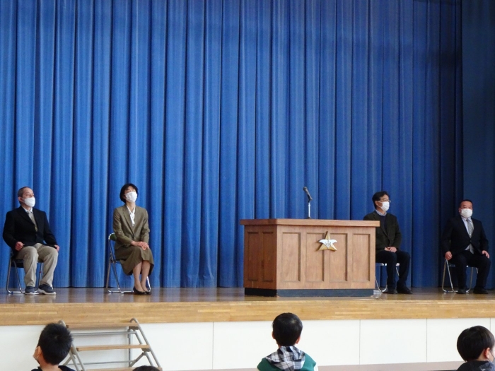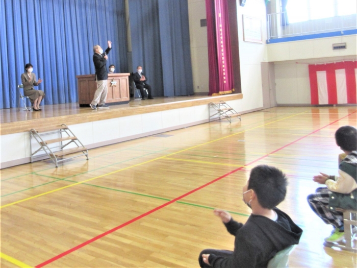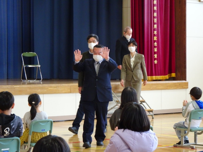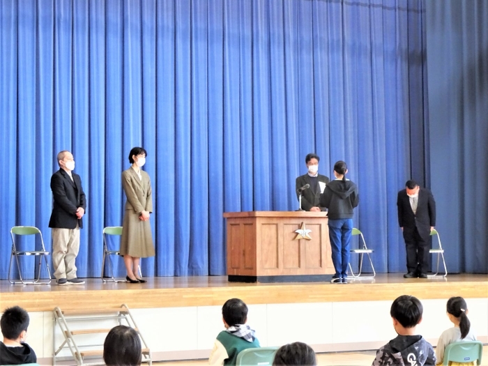 修了式終了後、卒業生が合流し離任式を行いました。この3月は、お世話になった4名の教職員が離任されます。最後のスピーチは、これまで見守ってくださった4名の先生方の大きな愛情を改めて実感するあたたかい言葉やパフォーマンスでした。児童代表から感謝の気持ちを伝えました。新天地でも元気でご活躍ください。大変お世話になりました。ありがとうございました。