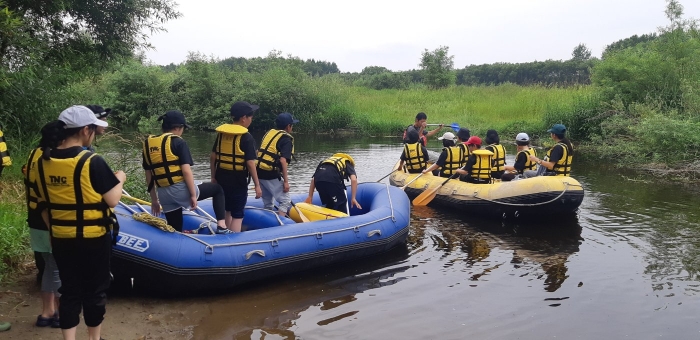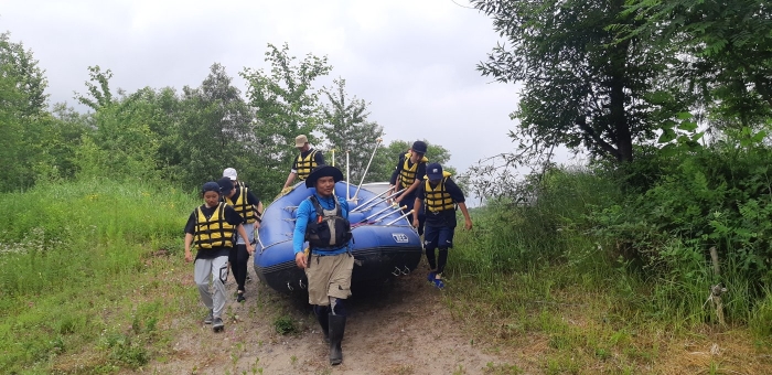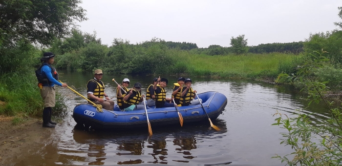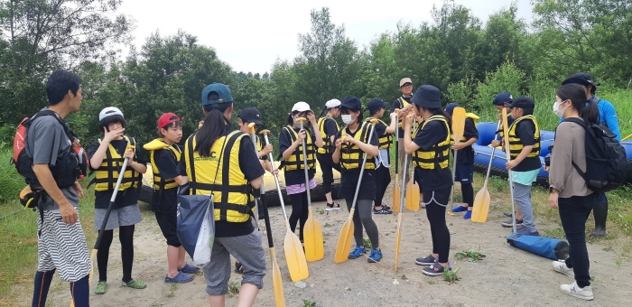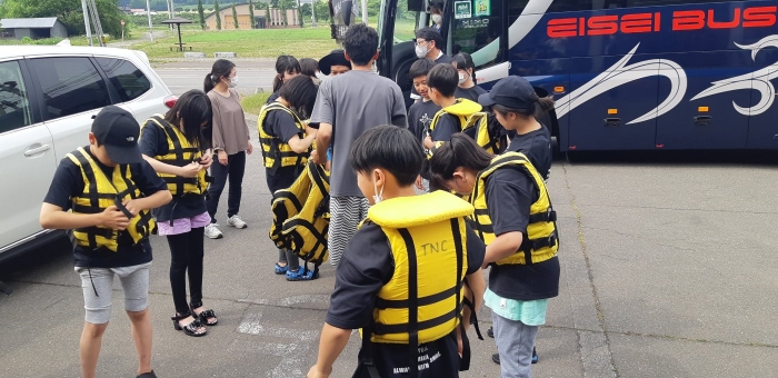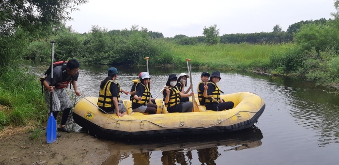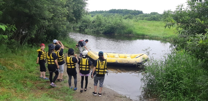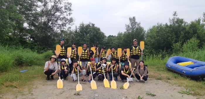 十勝川に到着!心配していたお天気は曇り。ライフジャケットを着用し川下り出発しました。