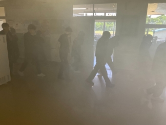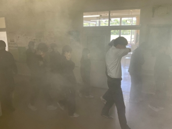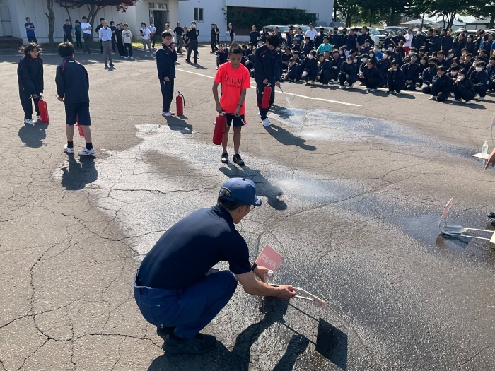 【別海中央中】 避難訓練を実施しました 2025年06月26日(木) 日々のできごと 24日(火)6時間目、地震からの火災を想定した避難訓練を実施しました。 別海消防署から2名の署員の方をお招きし、スモークマシンを使用しての訓練となりました。 署員の方に訓練の様子を確認していただき、避難終了後、講評をいただきました。 学級の代表6名が、消火器を実際に使用して消火訓練にチャレンジしました。 終始落ち着いた態度でスムーズに避難し、整列時にも整然と並ぶことができました。