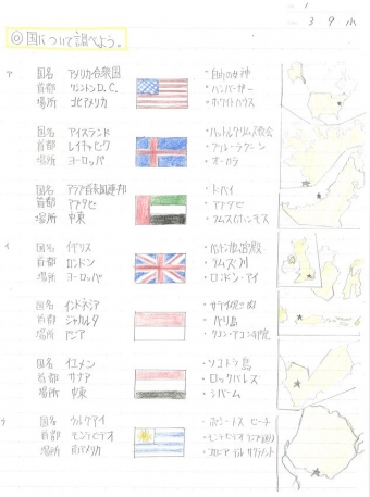 最後に「ア、イ、ウ、エ、オから始まる国名を1つずつ、ノートに書きなさい」と伝えました。
