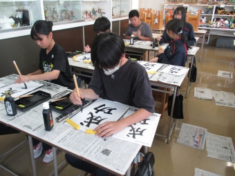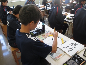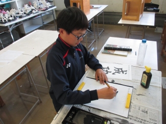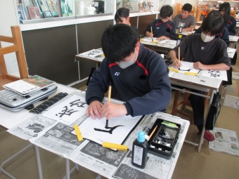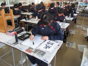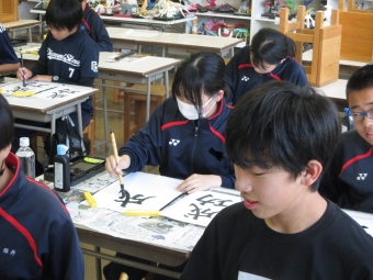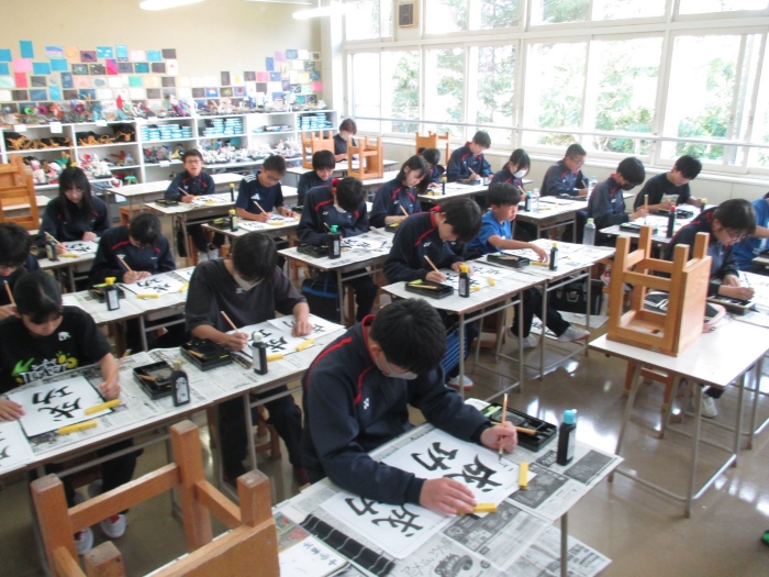 【別海中央中】 1年生「書写」の授業 2025年09月24日(水) 呼吸を整え、半紙に集中する姿が見られました。 普段は教室で授業しますが、書写は机が広い美術室で行います。 写真から集中力が伝わると思います。