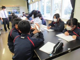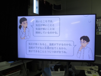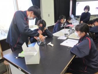 実験器具を使い、「気圧が下がると雲ができること」を実験を通して学んでいました。
