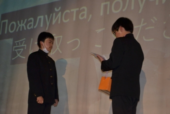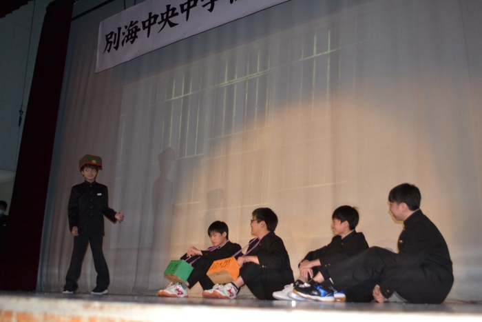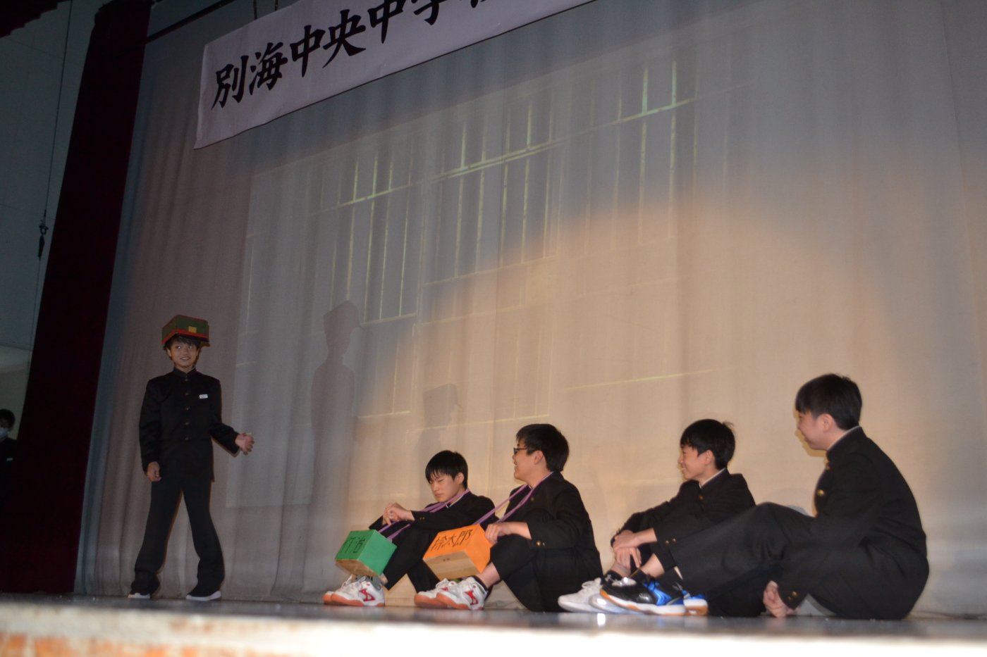 【別海中央中】 第58回文化祭(4)~2年生ステージ発表~ 2025年10月28日(火) NEW 《プログラムより》 私たちは「2年生らしい発表」を目標として職場体験で学んだことのプレゼンテーションと、親しくなったロシア人と日本人から始まる北方領土をめぐった友情を描く演劇を行います。 プレゼンテーションでは職場体験の様子を想像し、演劇ではその世界に入り込んでそれぞれ楽しんでいただけたら幸いです。