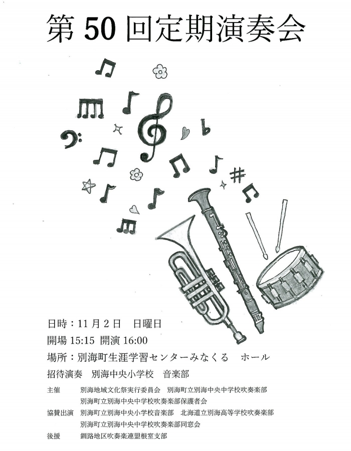 【別海中央中】第50回定期演奏会まで2日! 2025年10月31日(金) NEW 吹奏楽部の定期演奏会プログラムが完成しました。 今年は記念すべき50回目の定期演奏会です。 歴代顧問が思い出を語ったページもあります。 歴代の同窓生のお名前も掲示され、歴史の重さを感じます。 日時 11月2日(日) 開場 15時15分 開演 16時00分 場所 別海町生涯学習センターみなくる 別海中央小学校音楽部の招待演奏もあります。 是非、みなくるに足をお運びください。