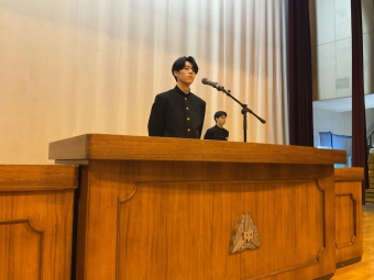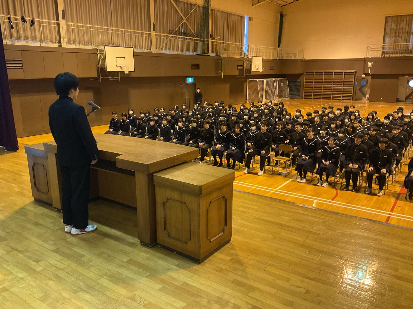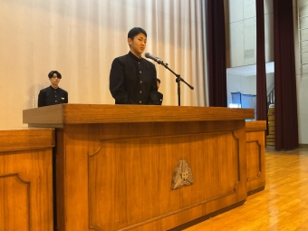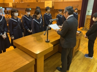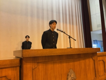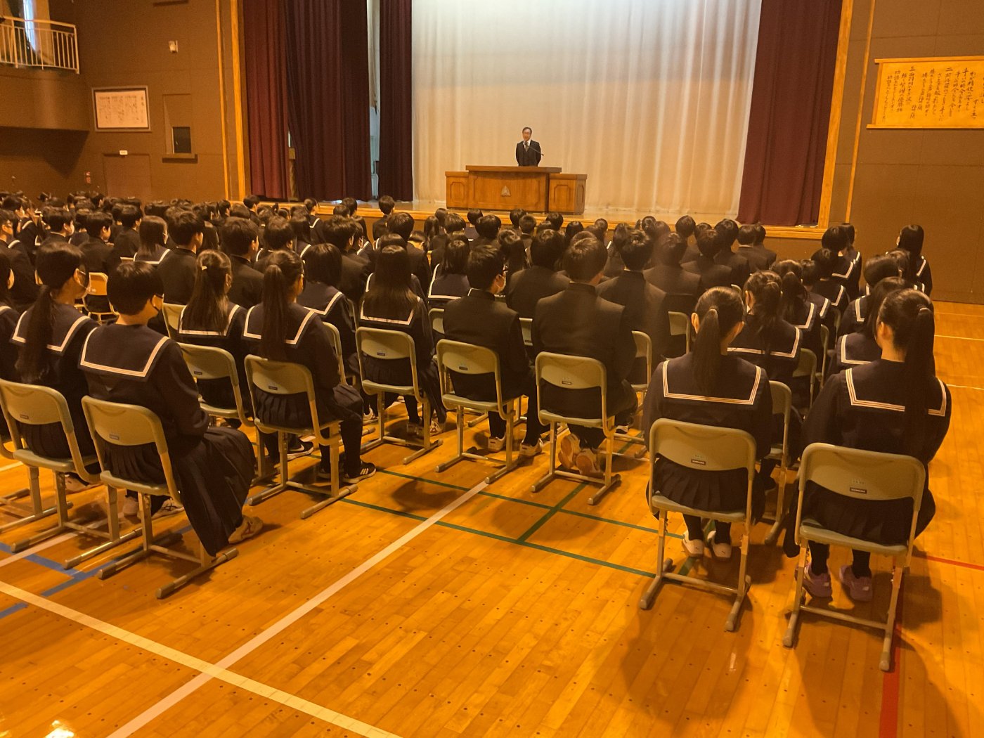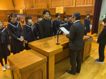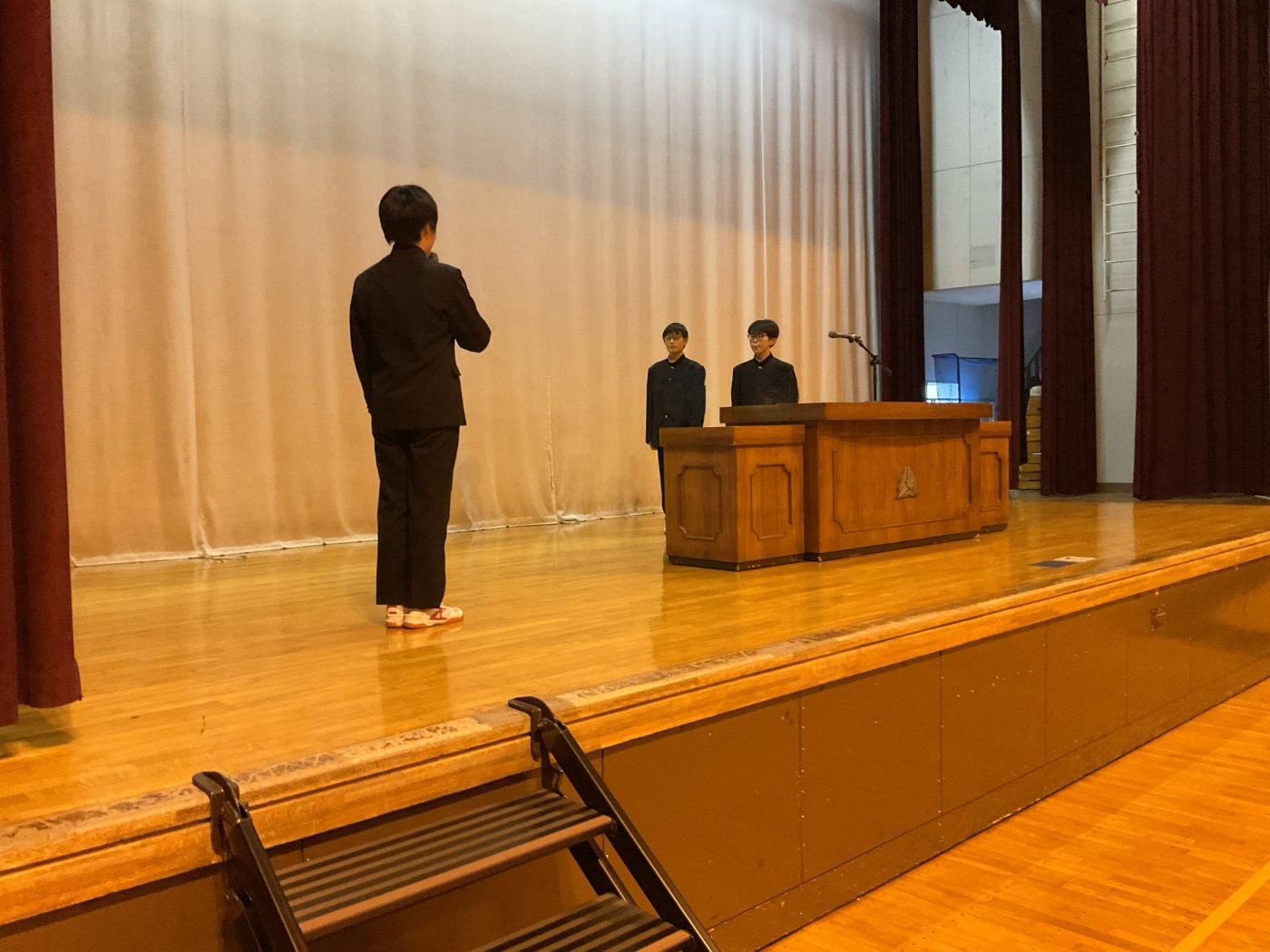 校歌斉唱に続き、校長先生、生徒会長、学年代表が2学期を振り返りました。