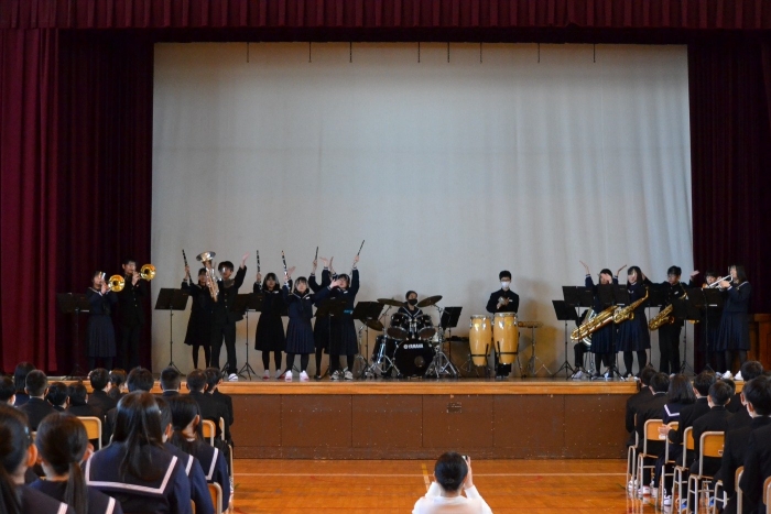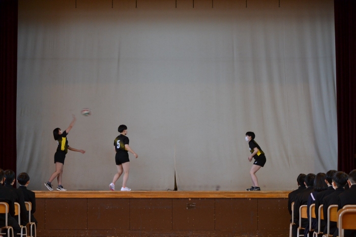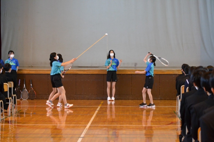 その後、各部が工夫を凝らした紹介を行いました。普段の練習の一場面を紹介する部やルールの解説を行う部、吹奏楽部は演奏を披露などあっという間のオリエンテーションでした。この紹介をもとに早速、放課後から部活動見学が始まりました。たくさんの人が部活動に加入してくれると嬉しいですね。
