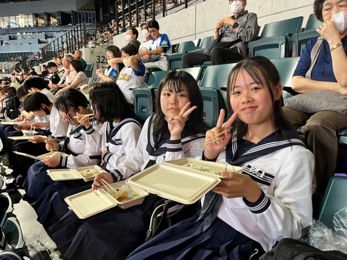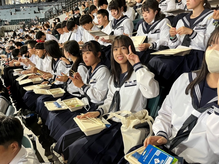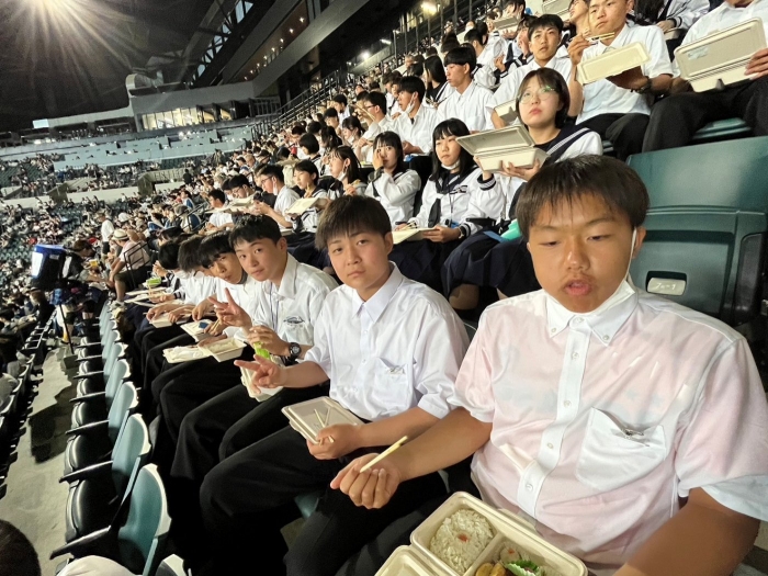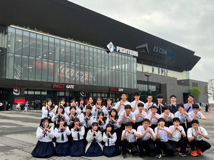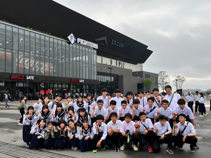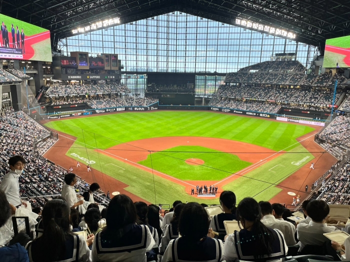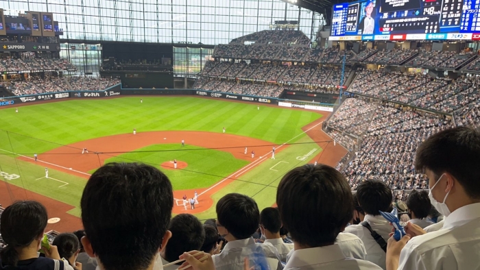エスコンフィールドに到着後、集合写真を撮影し、球場内に入りました。お弁当を食べながらのナイター観戦はうらやましい限りです。今年オープンしたばかりのエスコンフィールドですから、本校では初の修学旅行見学地です。日ハム対楽天戦はすでに試合が開始されていますが、生で見るプロ野球の雰囲気や球の速さを実感して欲しいと思います。