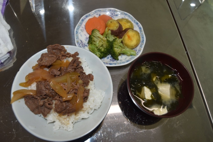 メニューは牛丼、みそ汁、蒸し野菜のサラダでした。