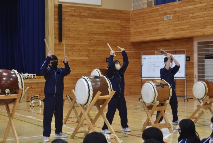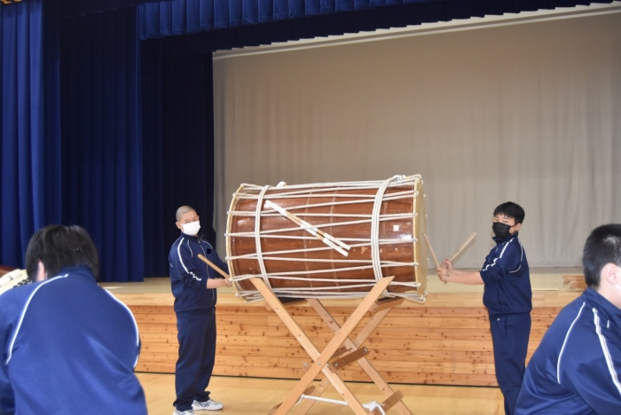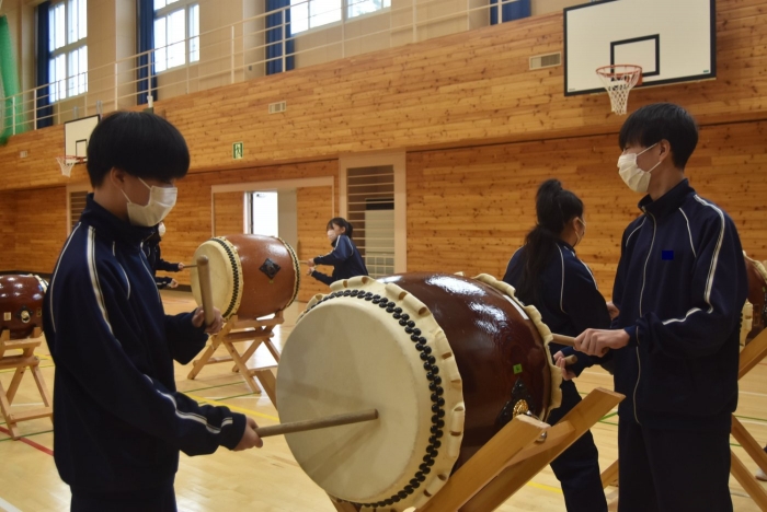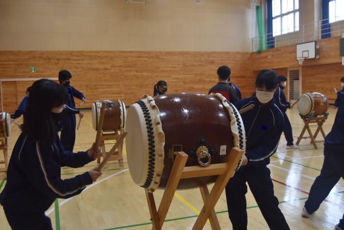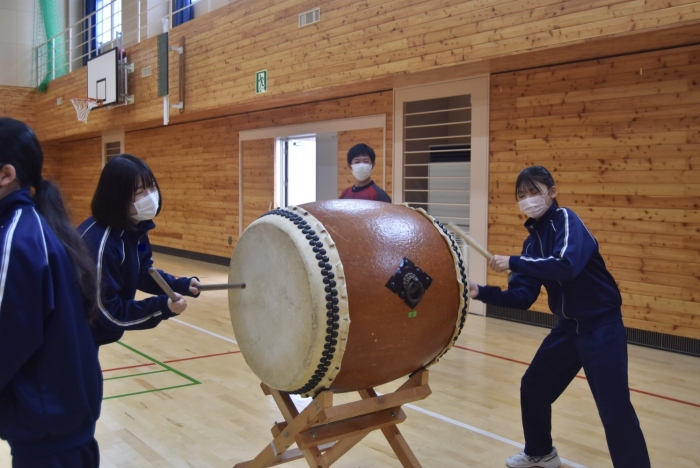 伝統の太鼓を学ぶ 2022年10月31日(月) 授業の様子 先週金曜日に2年生の音楽の授業で和太鼓の体験を行いました。 指導してくださるのは、文化祭活動で太鼓の指導をしてくださっている、本別酪農太鼓保存会の皆さんです。 文化祭の部門活動にも位置付けられている「知床太鼓」の演舞にはいつも魅了されます。 「やってみたい」「かっこいい」とあこがれを抱く生徒も多くいます。 その憧れの太鼓に触れ、地域の伝統文化を体験する貴重な時間になりました。 ご指導ありがとうございました。
