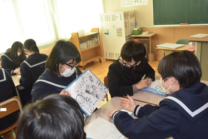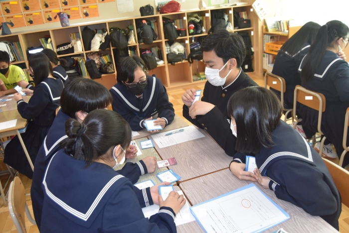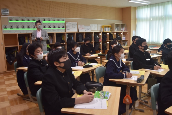 別海町をSDGsの視点で考える 2022年10月31日(月) 授業の様子 本校の総合的な学習の時間では、3年間を通して別海町の良さや課題をSDGsの視点で捉え、街づくりについて考える学習を行っています。 先週1年生は、花王株式会社のオンライン工場見学を行い、企業による取り組みを学びました。 3年生では持続可能な取り組みや生活を目指した具体的なアクションについて、カードゲームを通して学んでいました。 1年生。画面の向こうに最先端のエコ技術が・・・ 道内初実施ということで、新聞社も取材にいらっしゃいました。 3年生。 ボードには、アクションのアイディアが英語で書かれています。