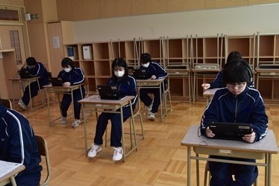 全国学力・学習状況調査 英語「話すこと」 2023年05月11日(木) 授業の様子 今年度の全国学力・学習状況調査の英語には「話すこと」調査があります。 本校でも、昨日3年生が調査問題に取り組みました。 ヘッドセットをつけて臨みます。 聞こえてくる音声に英語で答える調査形式です。 調査が終わった1組目の皆さんは、英語でしりとりをしていました。 生徒の皆さんの操作もスムーズで、大きなトラブルもなく無事に終了しました。 オールイングリッシュで答えるって難しいですね。 知っている単語を駆使して、何とか答えようと取り組んだ3年生でした。