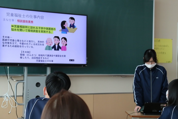 1学年「職業調べ」発表会 2025年03月04日(火) 日々のできごと 1年生も本日、総合学習があり、「職業調べ」の発表会を行いました。社長業や秘書、助産師、デザイナー、なかには刃物職人など、興味ある職業をパワーポイントで立派に発表しました。キャリア教育の一貫であるこの学習は来年度へと繋がっていきます。職業や社会や進路、いろいろなことに視野を広げ、自己開示しながら学びを深めてほしいです。