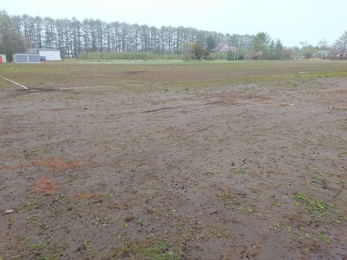グランドの転圧作業が今週入りました。画像を見ると雑草がたくさん生えているのがわかるでしょうか?土を掘るとミミズもでてきます。今後、土を削って除草剤を撒く処置も行う予定です。
