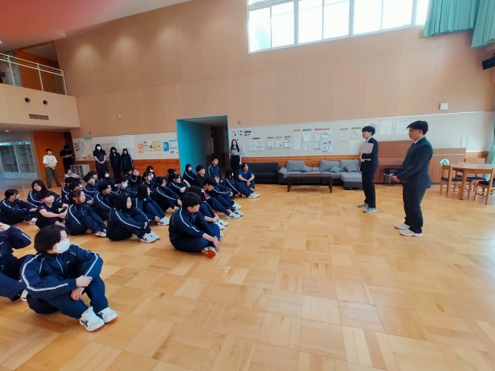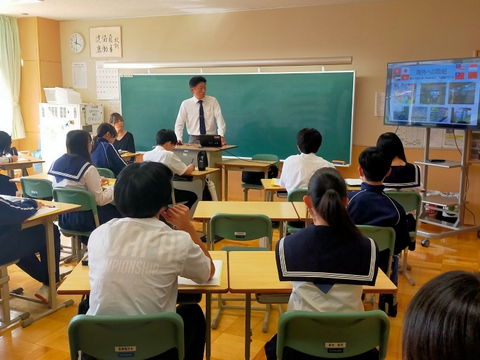 6時間目が終わり、他目的ホールで実習生のお別れの挨拶を行いました。本校の生徒たちが話しかけてくれたり、一緒に遊ぶこともできました。たくさんのことを学ぶことができた1週間でしたと感謝の言葉を述べてくれました。