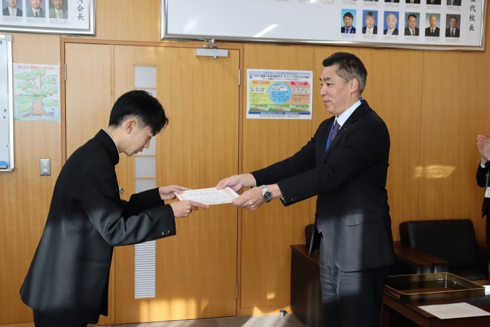 先週、「絆づくりメッセージコンクール」において生徒会が考案したメッセージが根室教育局奨励賞をいただきました。その表彰が本校で行われたのでご報告いたします。前生徒会長が頂いた賞状は玄関前ガラス棚にありますので、来校した際に見ていただければ幸いです。