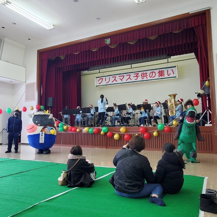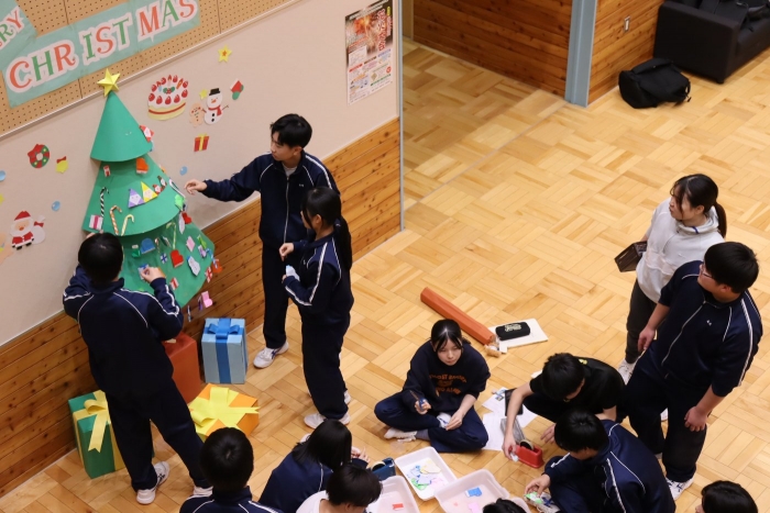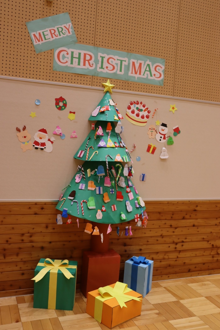また学校外活動ですが、先日12月14日に西公民館主催の「クリスマスの集い」がありました。吹奏楽部とボランティア4名が参加してきましたので、写真を掲載します。そして学校でも生徒会が進めてきたクリスマスツリーが完成しました。各クラスの手伝い生徒と協力して素敵な飾りつけになりました。