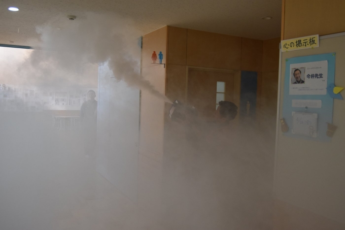 今回の避難訓練では、授業時間中に震度6の地震が発生し、その後、保健室付近から火災が起きたという想定で行いましたが、当日は消防署員の方にも来校していただき、実際にスモークを使用した、より実践的な訓練となりました。