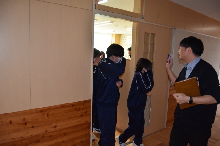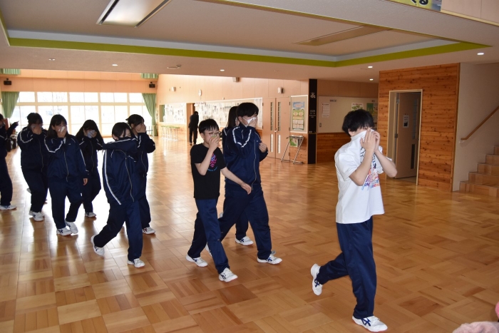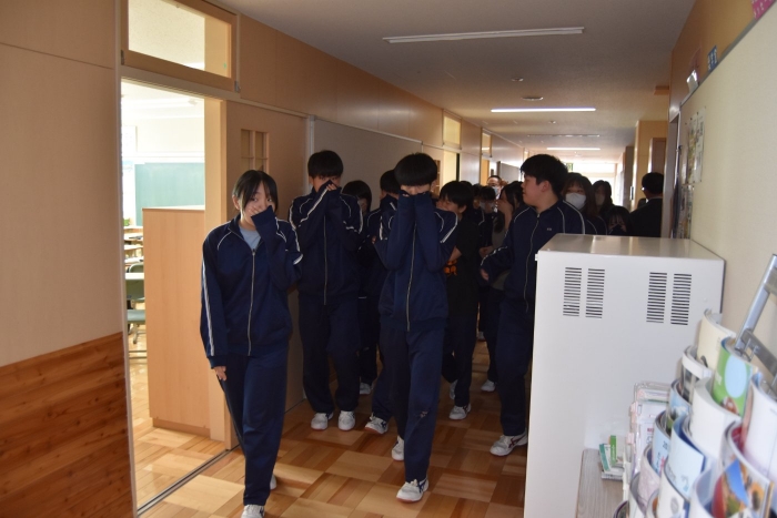 訓練後の振り返りでは、生徒から「煙を意識しながら、姿勢を低くして避難することができた」「ハンカチを持っていなかったが、ジャージの裾で口と鼻を覆って行動できた」など、状況を考えて行動した感想が多く聞かれました。