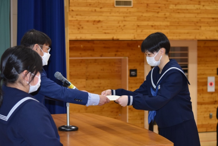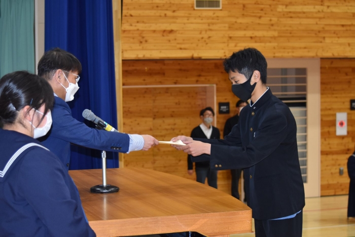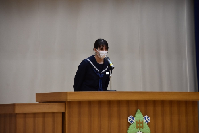 出場する3年生の生徒が決意表明を述べ、校長先生や生徒代表から激励の言葉がありました。