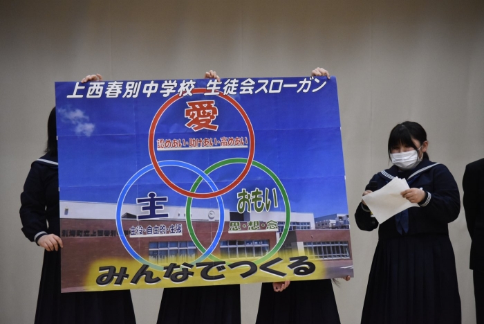 『みんなでつくる』…よりよいものを創り出すことのできる上西中生であってほしいという願いが込められおり、
